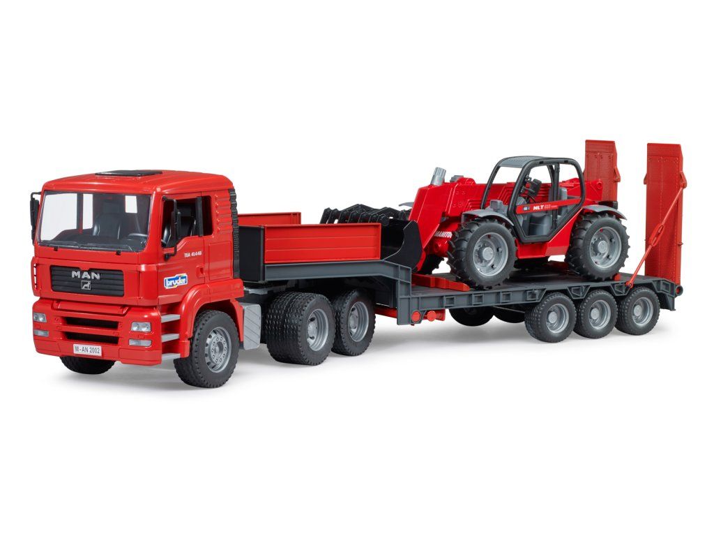Nízkopodlažné přívěsy se často používají k řešení těžkých přepravních úkolů, jako je přeprava velkých stavebních strojů ze stavby na stavbu. V tematickém světě stavebnictví BRUDER přepraví podvalník MAN TGA Manitou MT633 na další staveniště. Toto impozantní vozidlo má známé vlastnosti podvalníku MAN, jako je plně funkční točna přívěsu, sklopné podpěry a mobilní rampy. Dodávaný, řiditelný teleskopický nakladač má výsuvné a výškově nastavitelné teleskopické rameno a odnímatelnou lopatu. Rozměry: 20,5x29x,86 cm. Věk: 3+