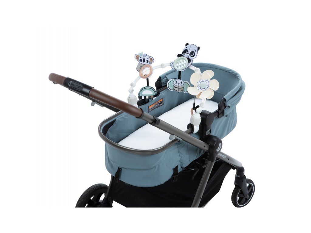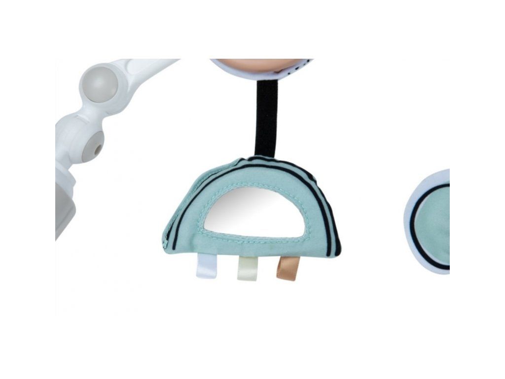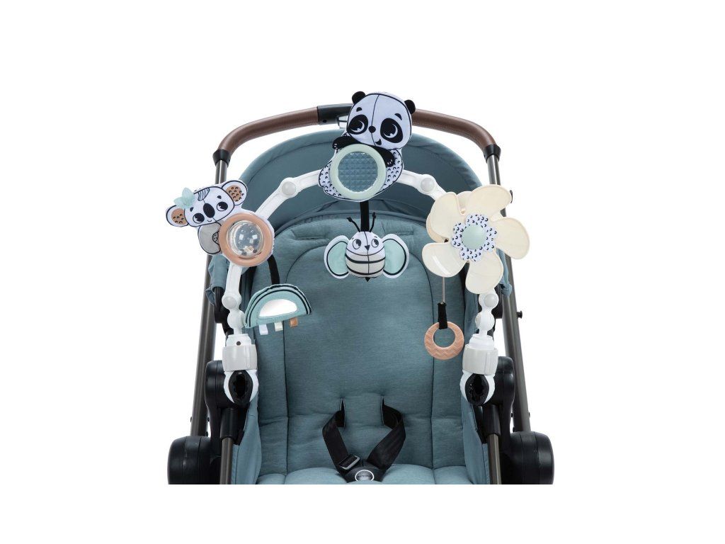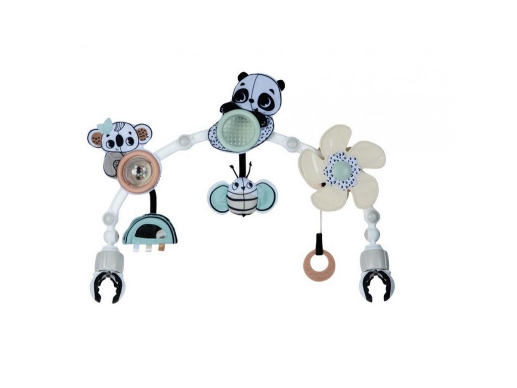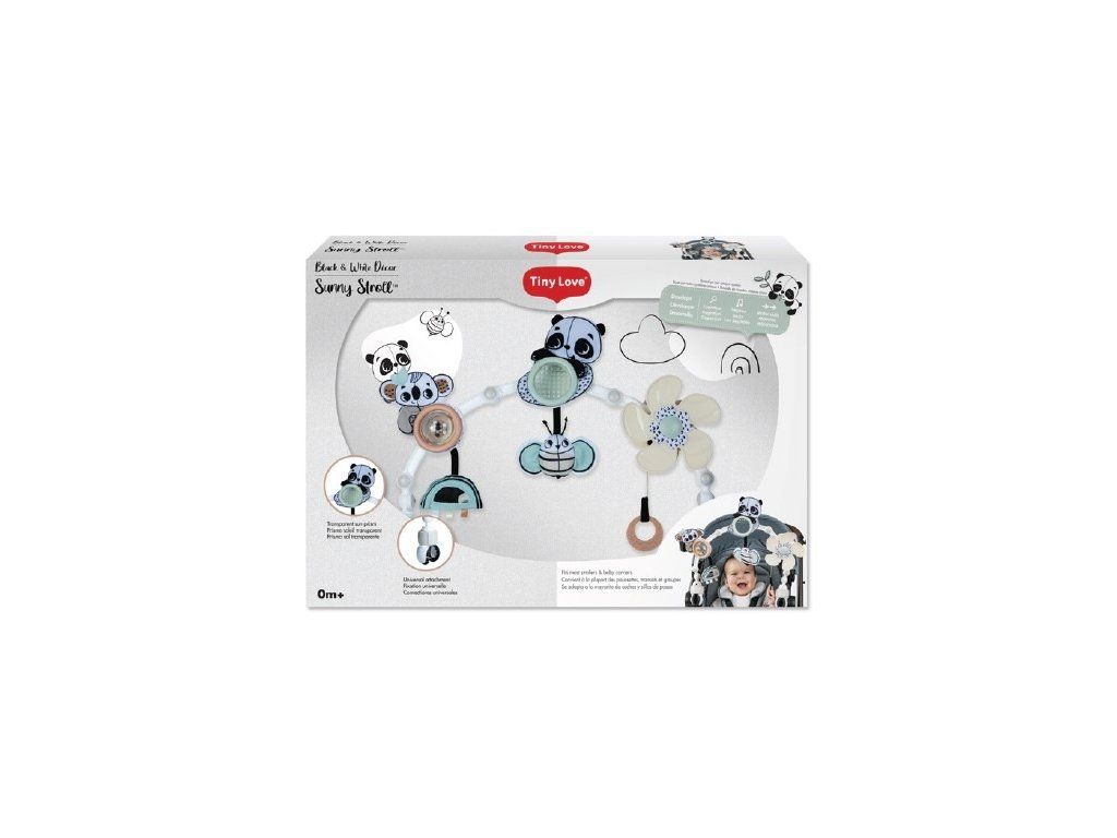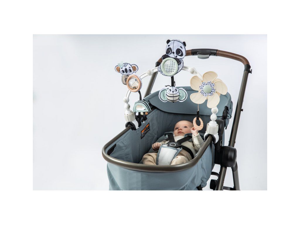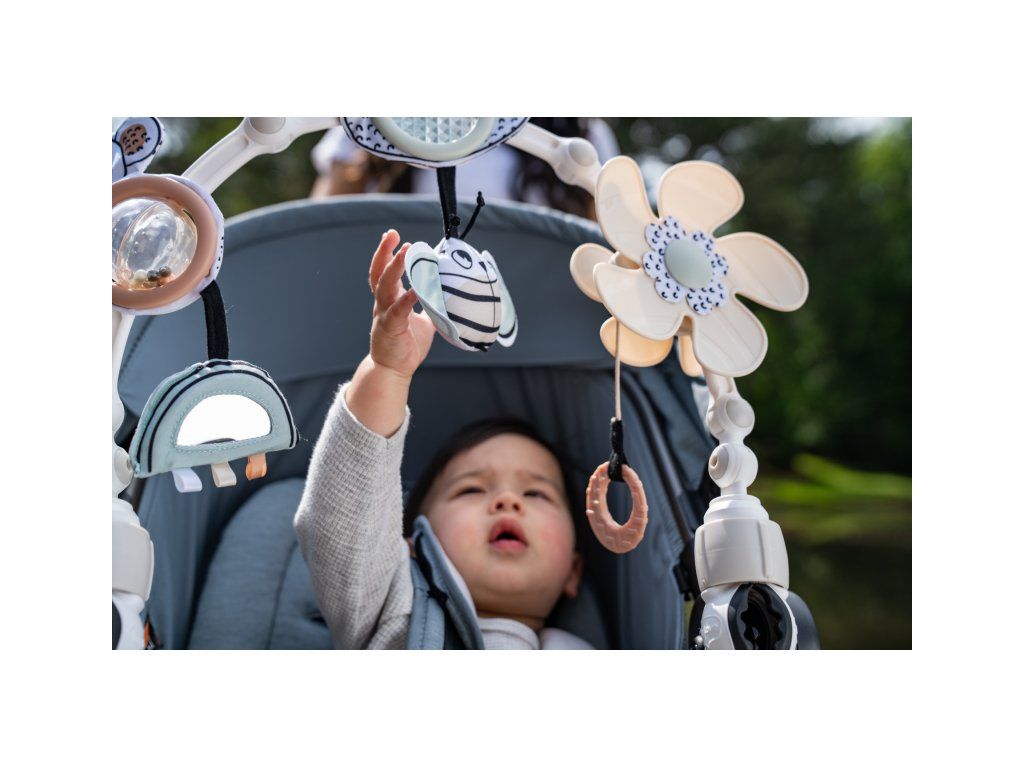 Hrazda Tiny Love je vhodná na kočárek, autosedačku či lehátko. Nabízí spoustu aktivit pro zabavení dítěte na cestách i doma, např. chrastítko, kousátko, otáčející se větrník nebo bezpečné zrcátko.