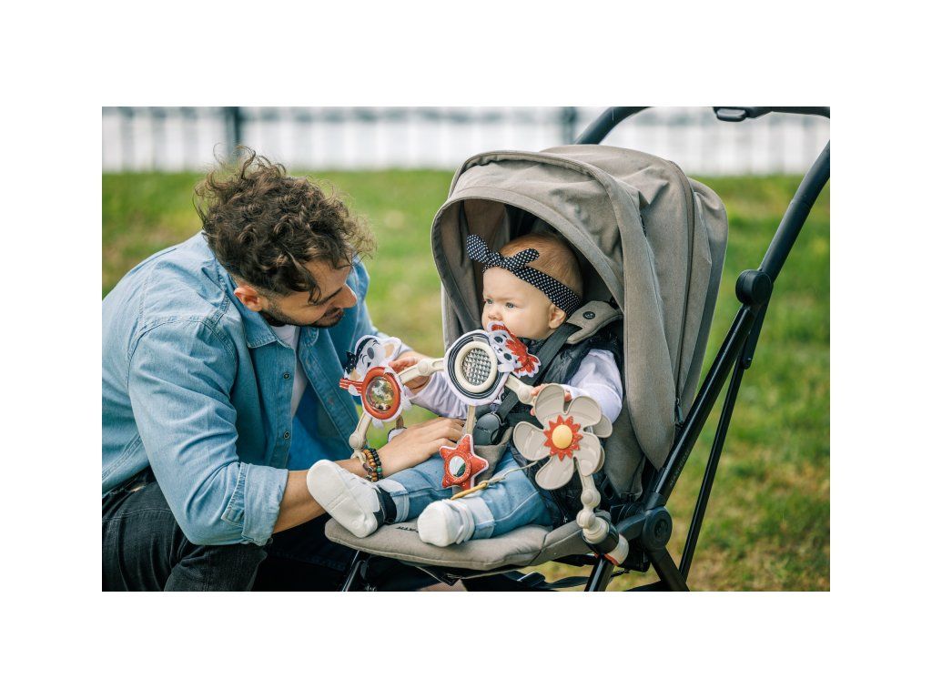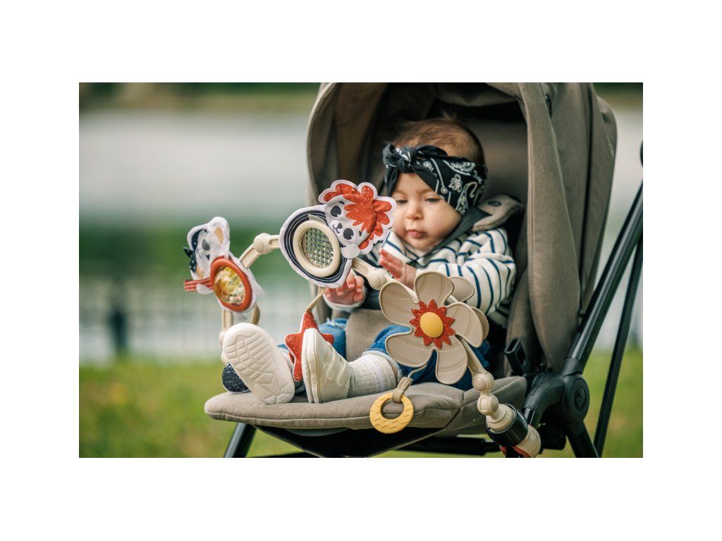 Hrazda Tiny Love je vhodná na kočárek, autosedačku či lehátko. Nabízí spoustu aktivit pro zabavení dítěte na cestách i doma, např. chrastítko, kousátko, otáčející se větrník nebo bezpečné zrcátko.