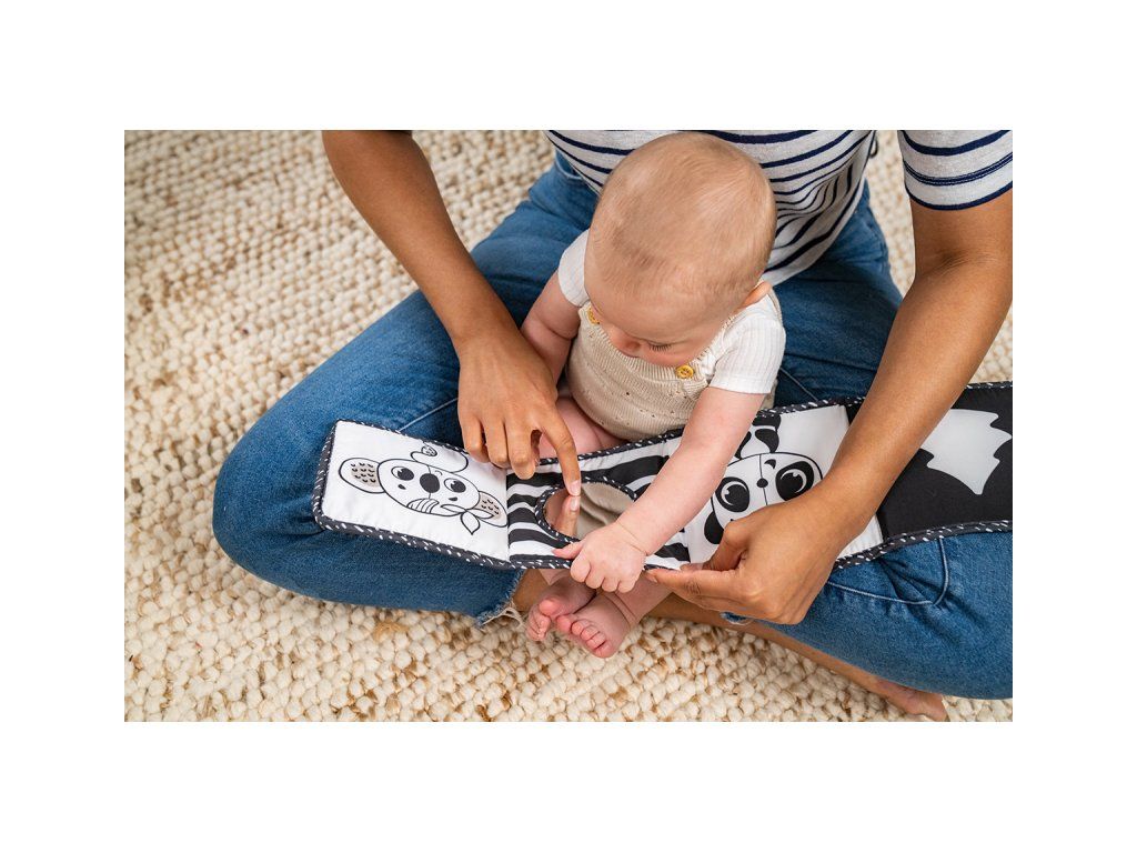 - 0-3 měsíce: strana s bezpečným zrcátkem a vysoce kontrastními, jednoduchými černobílými obrázky, které podněcují rozvoj smyslů a emoční inteligence dítěte.