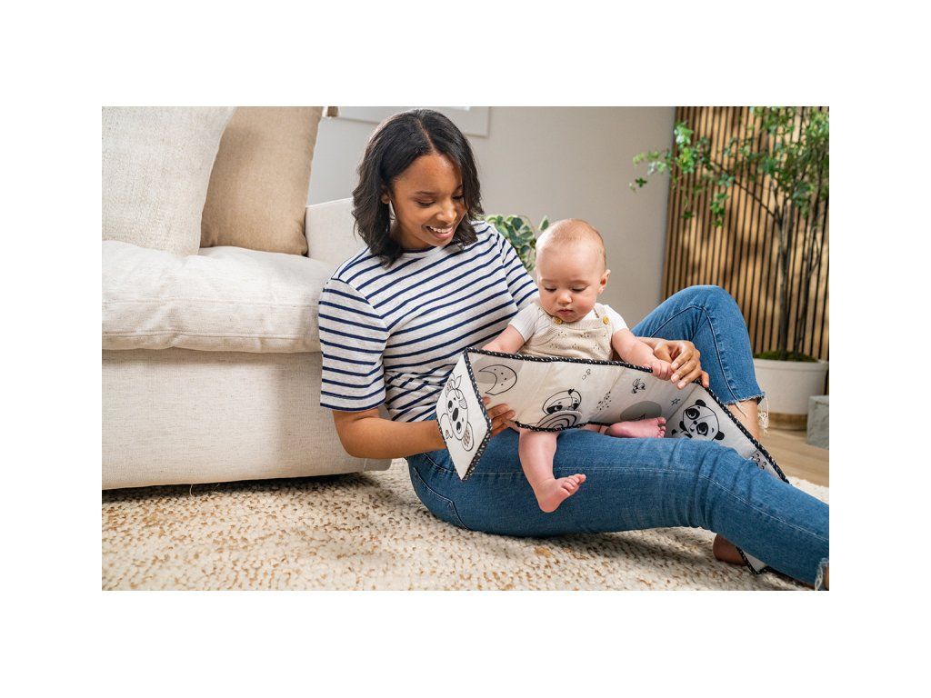 Knížka drží samostatně postavená pro hru na bříšku, nebo ji lze umístit do postýlky či kočárku.