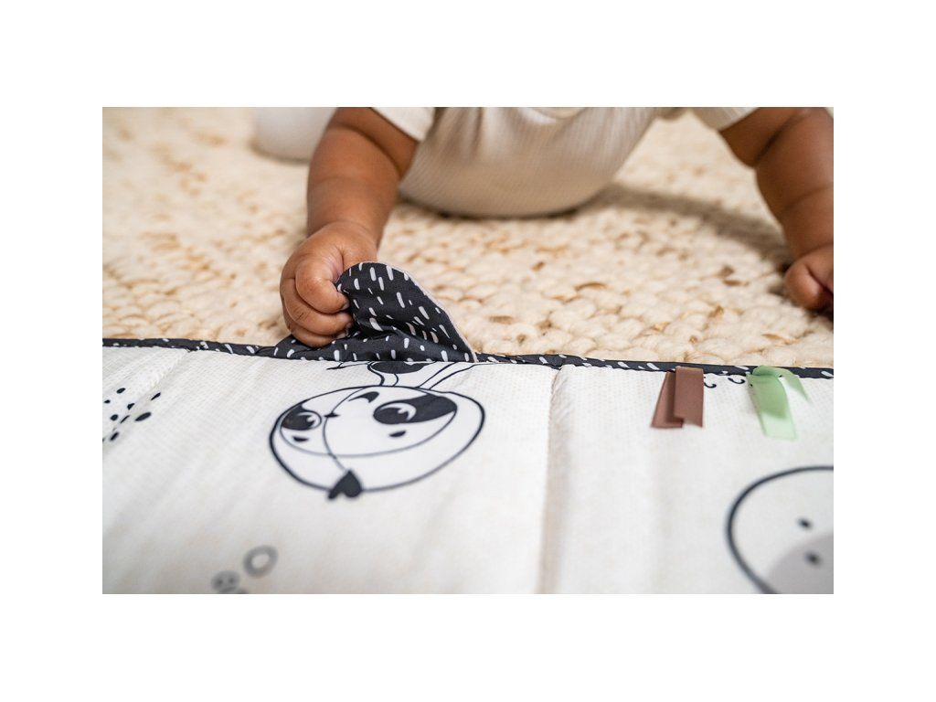 - Od 3 měsíců: strana s kontrastními obrázky v základních barvách a různorodými texturami ke zkoumání, které podporují rozvoj smyslů a jemné motoriky dítěte.