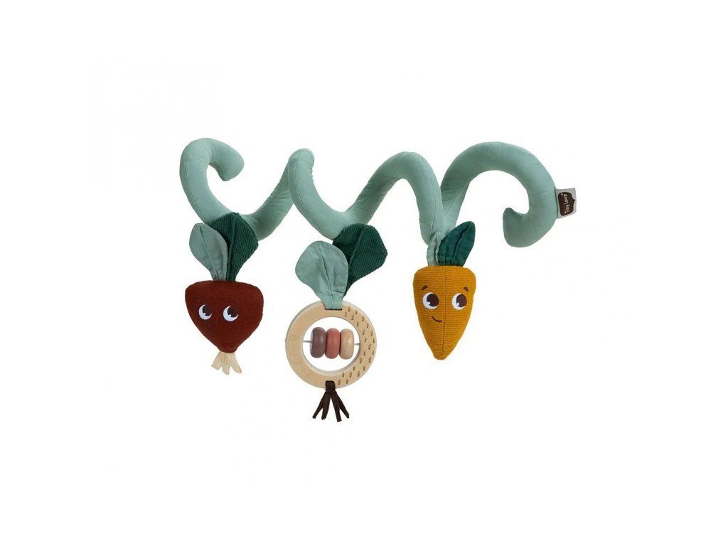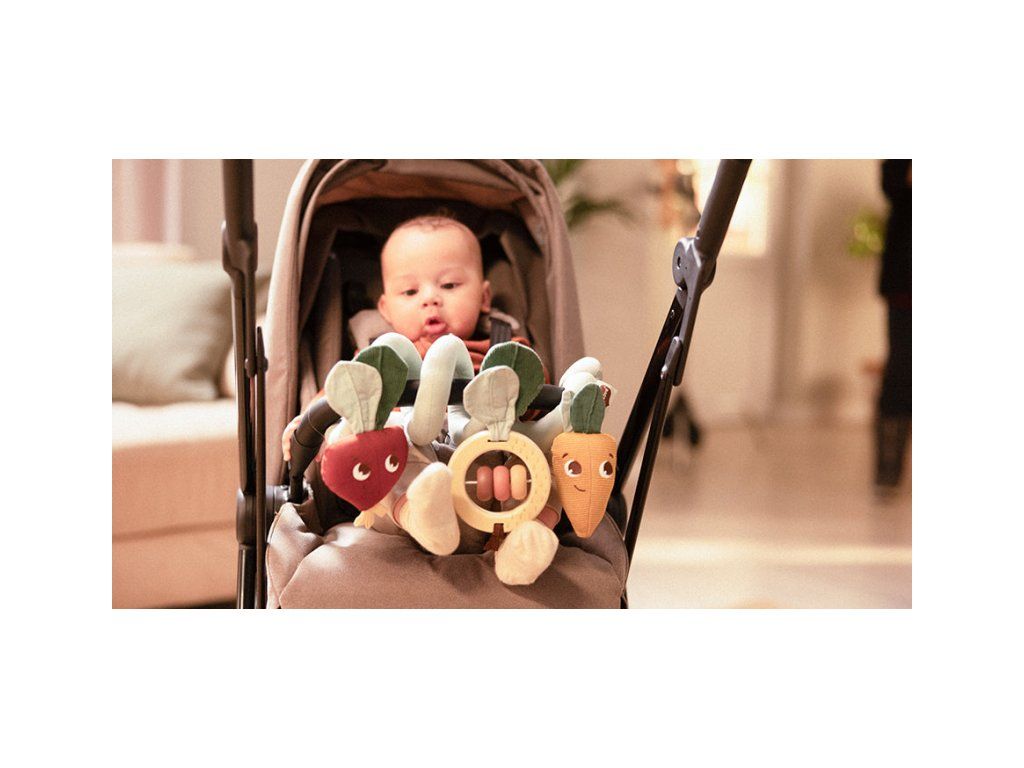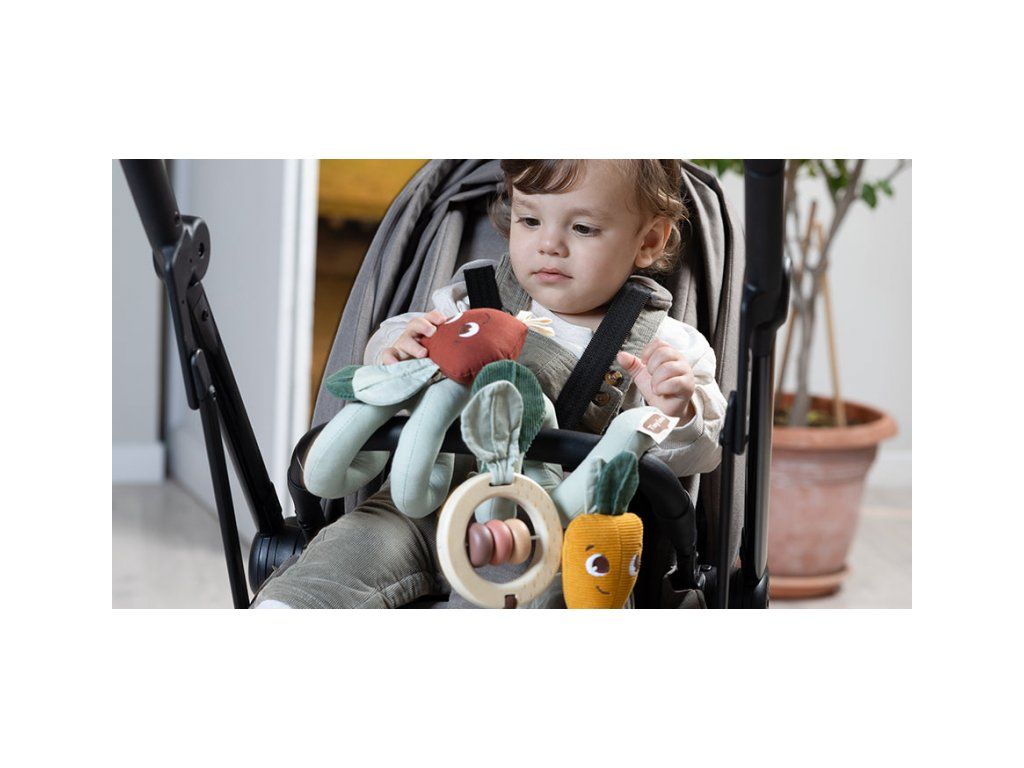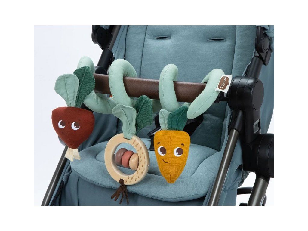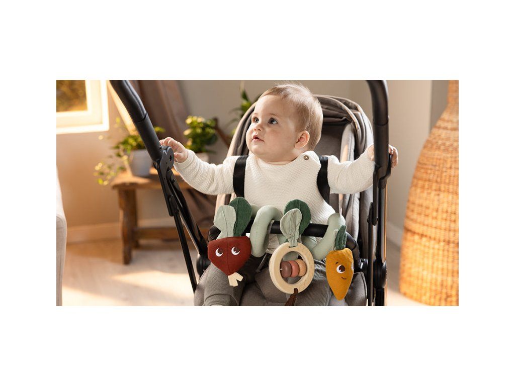 Hrazda na kočárek Tiny Love navržená s láskou a péčí odborníky na vývoj dítěte zabaví vaše dítě během procházek s kočárkem. Nabízí různorodé aktivity, které poskytují smyslovou stimulaci a rozvíjejí jemnou motoriku. Pozornost dítěte upoutá dřevěná chrastítka s korálky a strukturovanými lístky, řepa s bavlněnými stuhami a listy i mrkvička z manšestru s bavlněnými lístky.