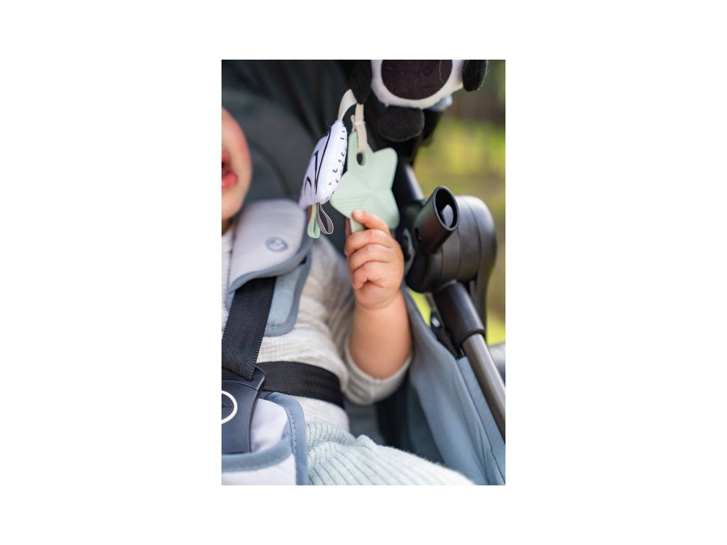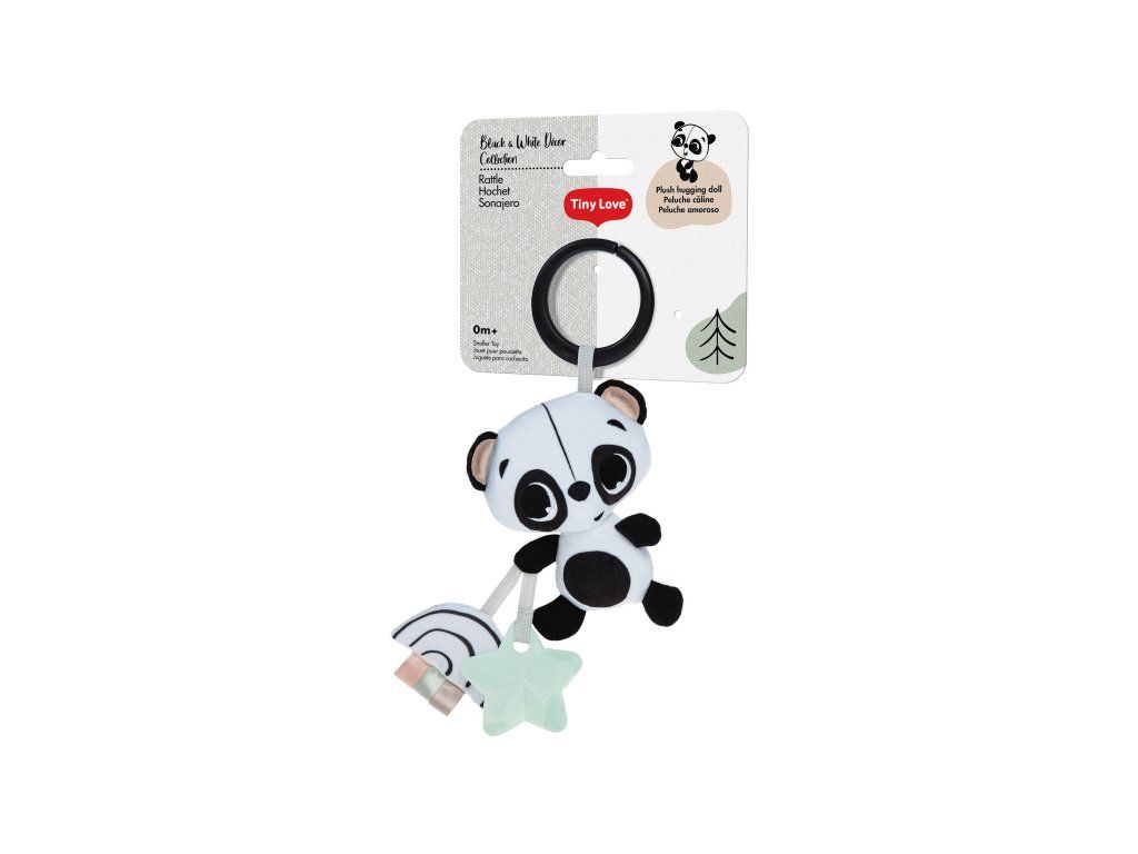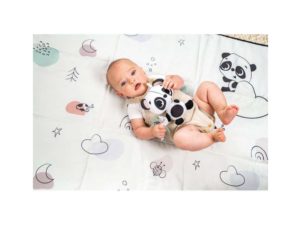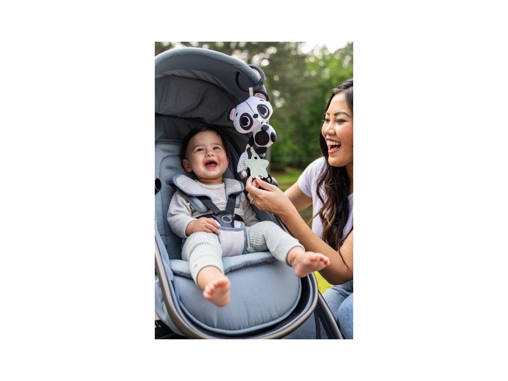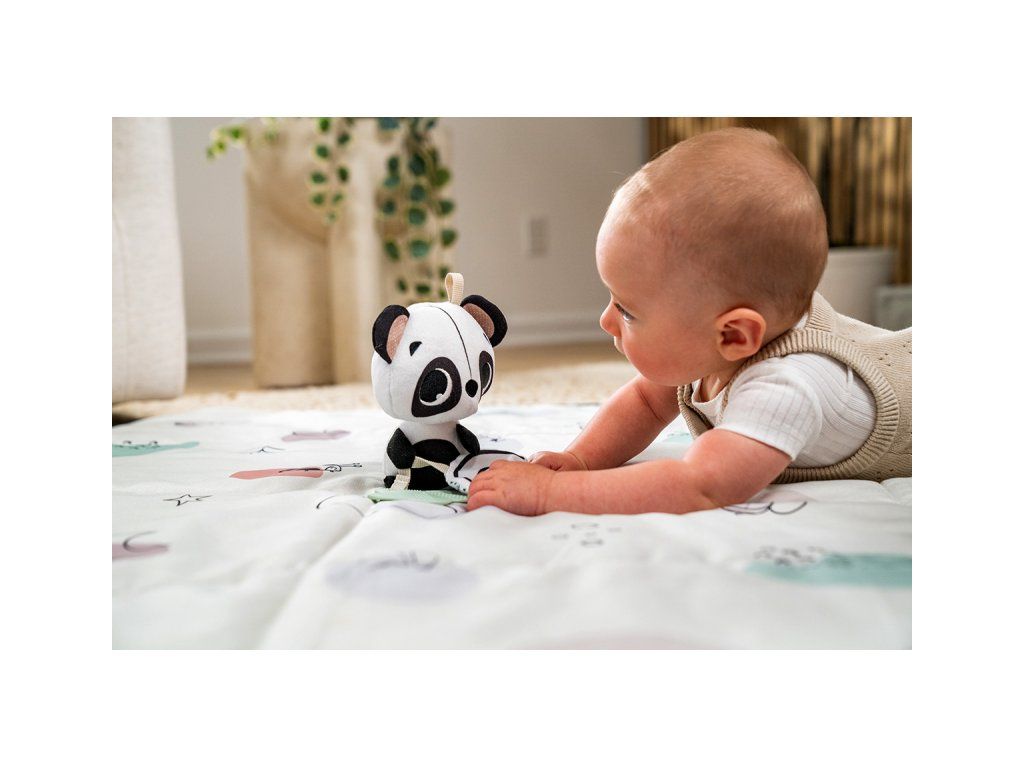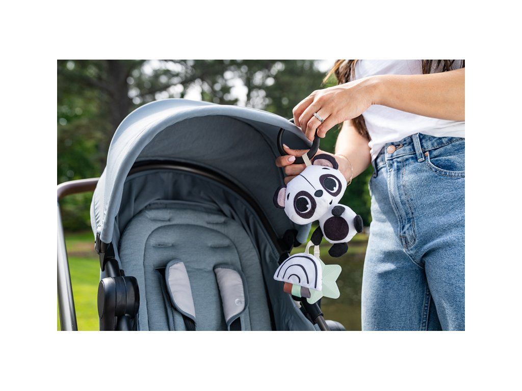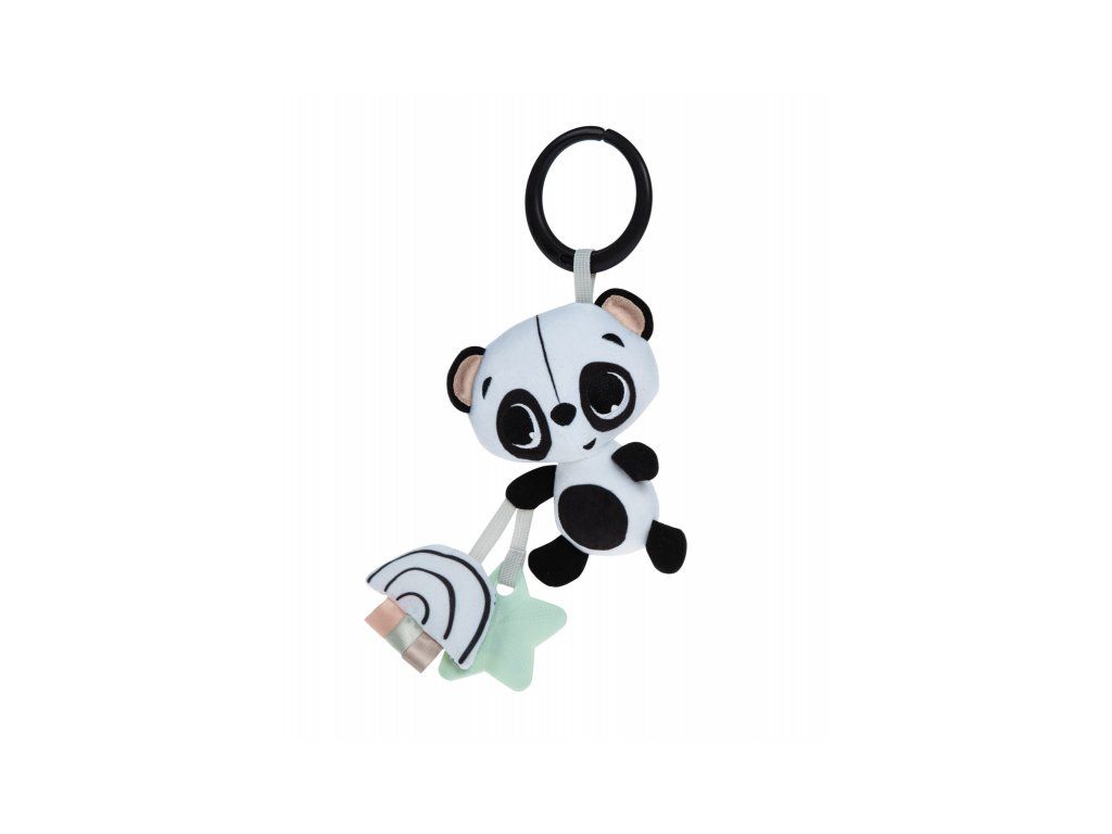 Měkká hračka v podobě roztomilé pandy při pohybu jemně chrastí. Různorodé textury na hračce lákají dítě ke zkoumání. Kroužek umožňuje snadné zavěšení na autosedačku, kočárek či postýlku.