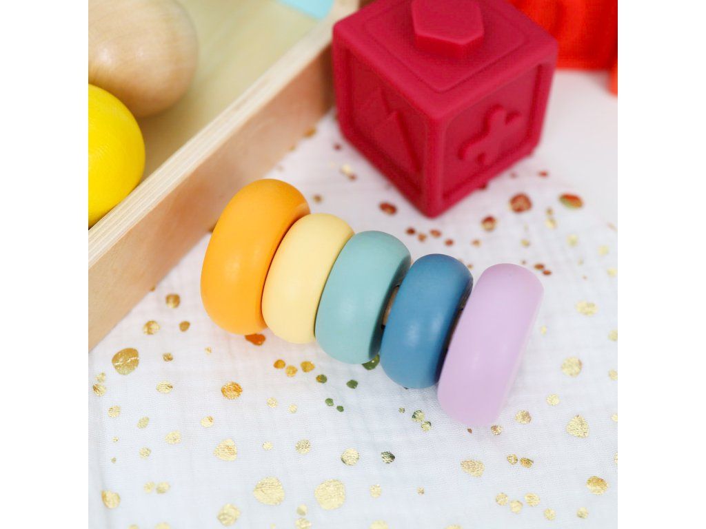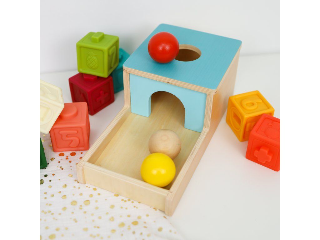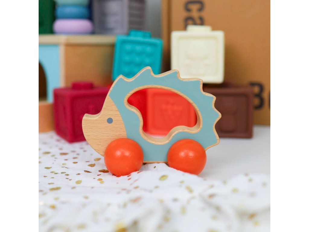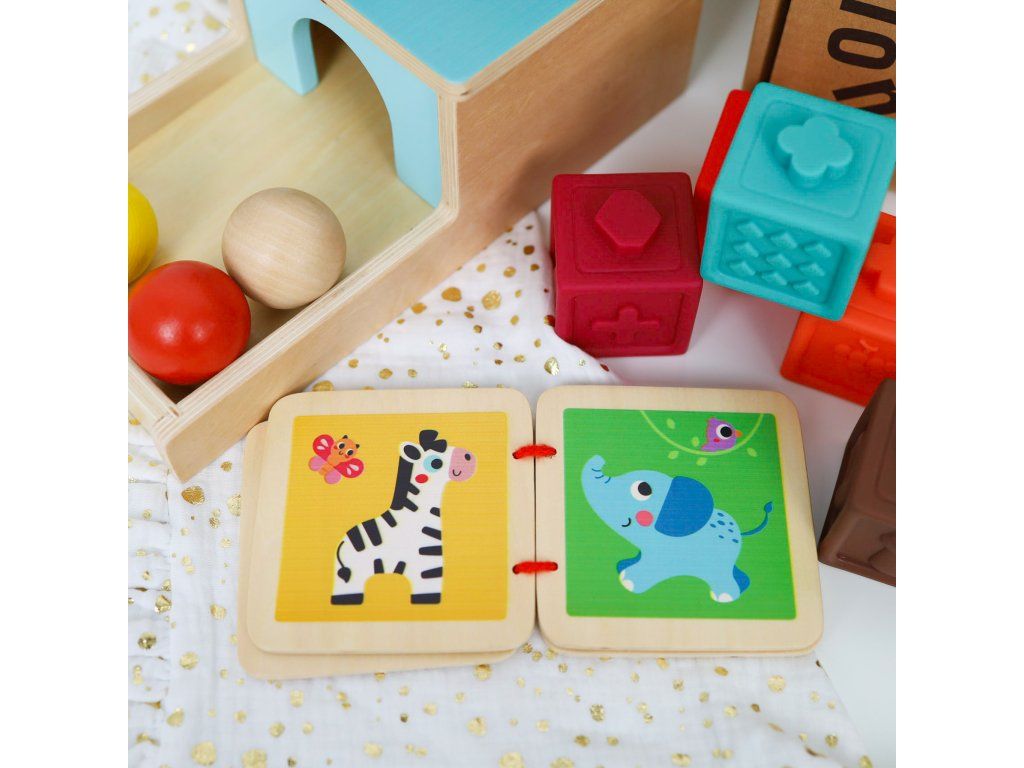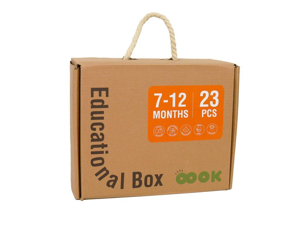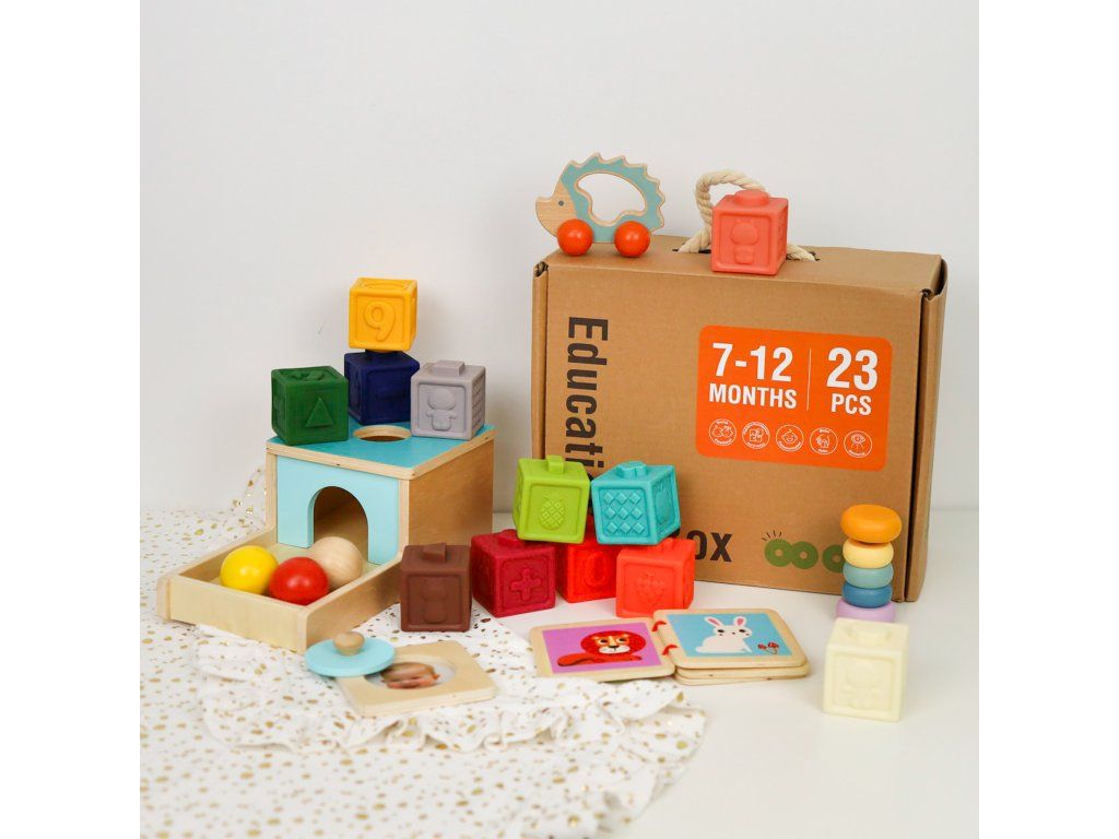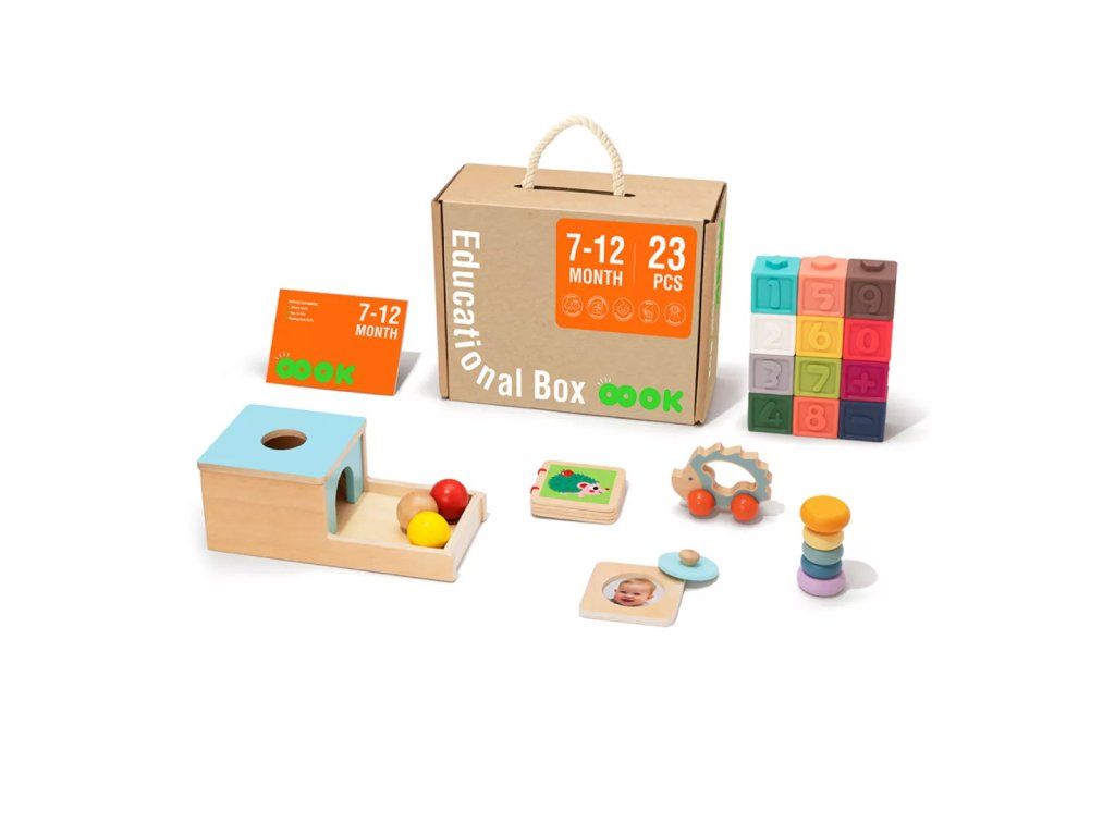 7–12 měsíců Vzdělávací box Mini 6 ks 6 didaktických hraček pro miminka v jednom balení Vzdělávací box Mini od Tooky Toy je určen pro miminka přibližně od 7 do 12 měsíců. Obsahuje 6 montessori senzorických a didaktických hraček, které podporují zdravý psychomotorický rozvoj vašeho miminka a podněcují jeho smysly: zrak, hmat i sluch. Rozvíjí i jeho logické myšlení či koordinaci ruka-oko. Nechybí ani podrobná příručka pro rodiče, díky které budete vědět, kdy jakou hračku miminku představit a jak si s ní hrát.Box obsahuje: první vkládací puzzle s možností vložení fotky, první dřevěnou knížku, ježka na kolečkách do ručičky, dřevěnou chrastítko, montessori vkládací box na 3 kuličky, 12 měkkých kostek s číslicemi od 0 do 9 a znaménky + a -, návod k použití v angličtině.Bezpečné vzdělávací hračky pro nejmenší Díky Vzdělávacímu boxu nebudete kupovat zbytečně mnoho nevhodných či plastových hraček. Hračky Tooky Toy jsou vyráběny s ohledem na životní prostředí ze dřeva z udržitelného lesnictví a dalších bezpečných materiálů. Barvy jsou netoxické a zcela bezpečné. Až dítko vyroste, postoupí k dalšímu Edukačnímu boxu 13–18 měsíců a tento můžete nechat pro mladší sourozence nebo věnovat někomu jinému. Edukační box Tooky Toy je vhodný jako dárek pro miminko.