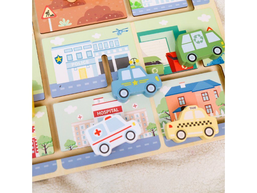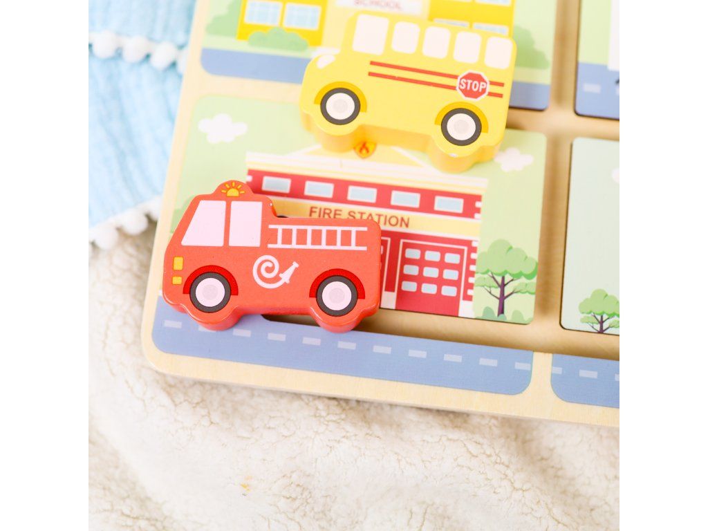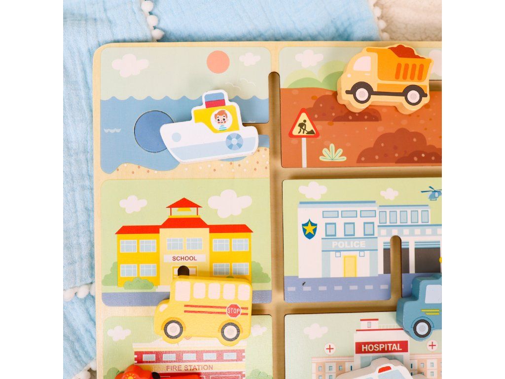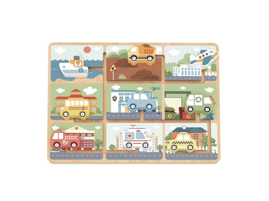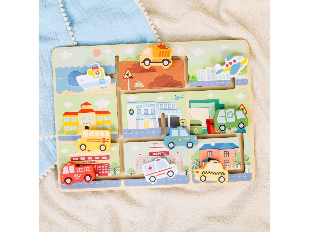Bludiště Dopravní prostředky Motorické bludiště vhodné od 18 měsíců Dřevěný motorický labyrint s dopravními prostředky od Tooky Toy v nadčasových pastelových barvách zaujme děti od 18 měsíců. Originální aktivní deska obsahuje 9 obrázků různých míst a 9 posuvných dopravních prostředků. Těmi děti pohybují v rámci kolejí, jak chtějí. Mohou je ale také přiřazovat k obrázku, ke kterému patří, například hasičské auto k hasičské stanici, sanitku k nemocnici či loď na vodu.Skvělé na rozvoj jemné motoriky Nádherný motorický labyrint také rozvíjí koordinaci pohybů, schopnost soustředění, pozorovací i logické schopnosti. Dřevěné hračky pro děti od Tooky Toy jsou vyrobeny z pevného dřeva z udržitelného lesnictví, natřené netoxickými barvami a pro děti jsou bezpečné.