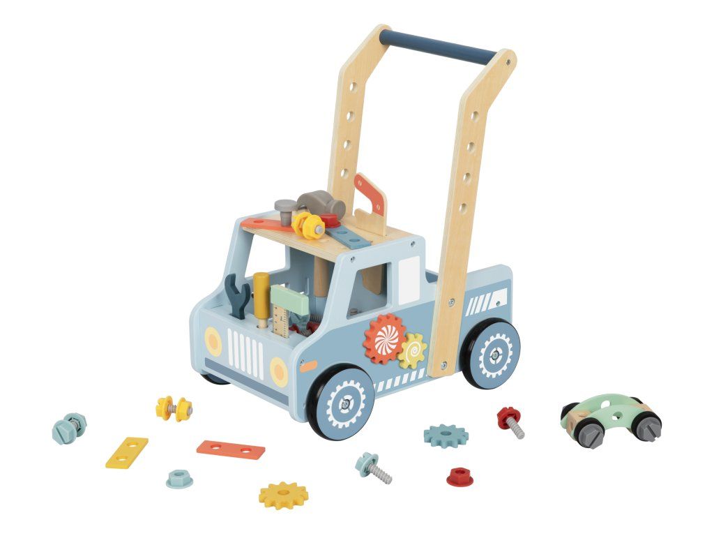 Chodítko a pracovní pultík s nářadím 2v1 Multifunkční pomůcka pro první krůčky Dřevěné multifunkční chodítko s aktivitami a nářadím od Tooky Toy je skvělým pomocníkem pro malé kutily. Chodítko funguje také jako pracovní pultík, na kterém děti najdou různé barevné nářadí a dílky na skládání a šroubování. Malí kutilové si tak mohou opravovat, tvořit a vozit své „nářadí“ po bytě.Rozvíjí motoriku a kreativitu Při chůzi s chodítkem získávají děti potřebnou stabilitu a jistotu pohybu, zatímco práce s nářadím procvičuje jejich jemnou motoriku. Šroubováním, skládáním a manipulací si zároveň rozvíjejí logické myšlení a představivost. Hračka je vyrobena z odolného dřeva a bezpečných materiálů, ideálních pro malé ručičky.