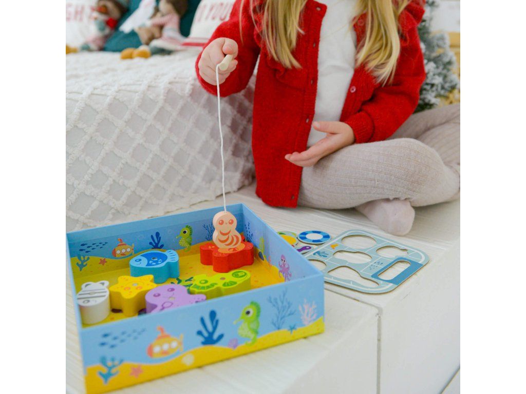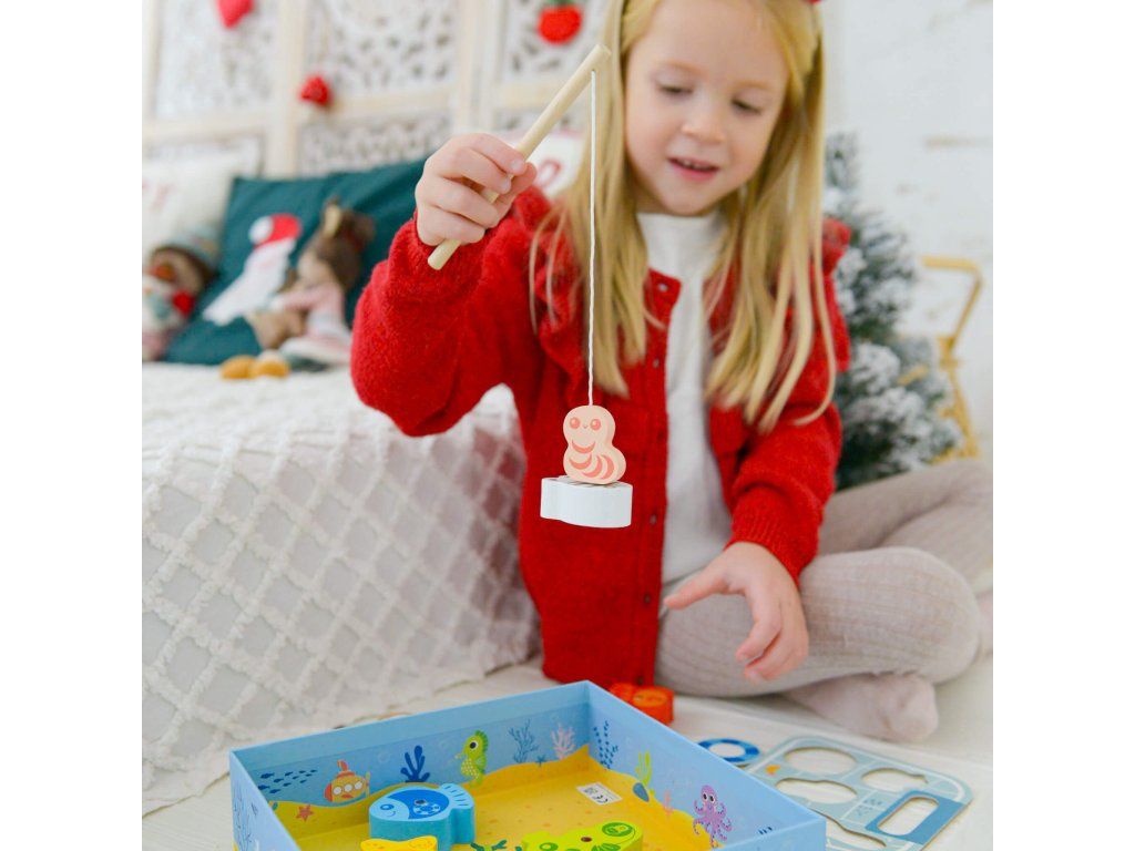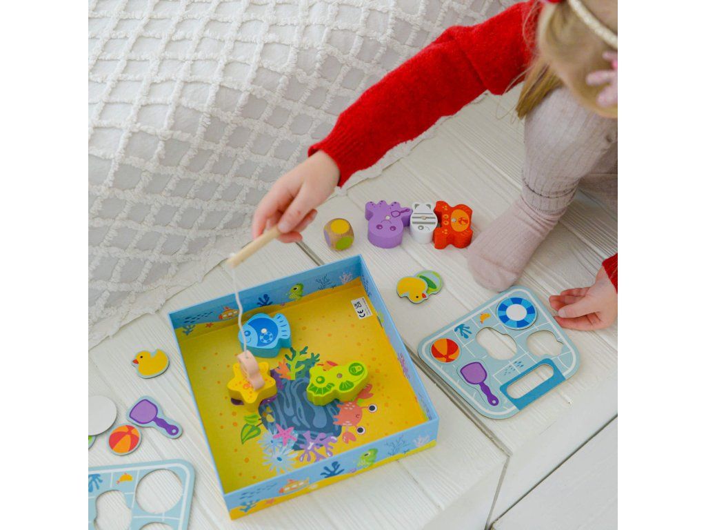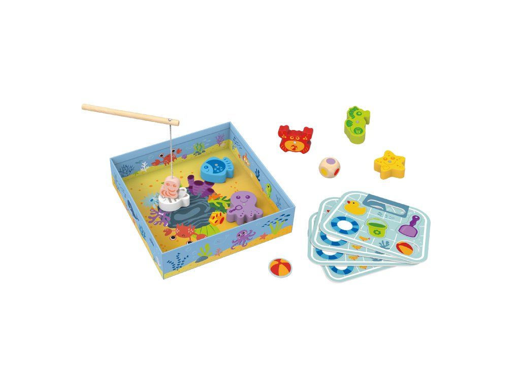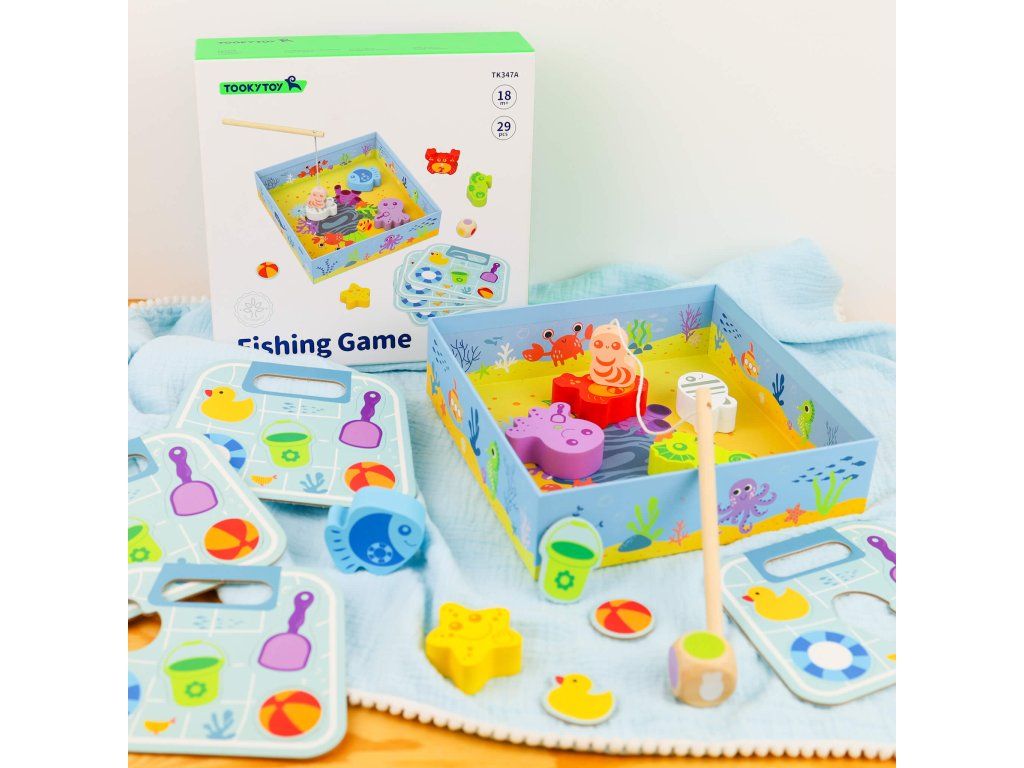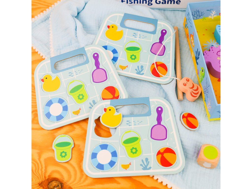Chytání rybiček Moře Zábava pro celou rodinu! Dřevěná společenská hra pro nejmenší Chytání rybiček od Tooky Toy zabaví již děti od 18 měsíců. Mohou si ji hrát samostatně a cvičit si jemnou motoriku při chytání mořských živočichů, nebo si může hrát celá rodina podle přiložených pravidel. Hra obsahuje 1 udici, 1 kostku, 1 podložku představující moře, 6 dřevěných mořských tvorů a 4 kartonové karty s hračkami, které slouží ke sbírání bodů při hře.Chytání rybiček podporuje rozvoj dovedností Děti si nejprve cvičí jemnou motoriku, koordinaci pohybů i trpělivost. Jak rostou, postupně se seznamují s hraním společenských her a dodržováním základních pravidel, jako je hod kostkou, střídání pořadí, vyrovnávání se s výhrou, respektive prohrou. Dřevěné hračky Tooky Toy jsou vyráběny s ohledem na bezpečnost dětí a minimální dopad na životní prostředí z kvalitních a bezpečných materiálů.Návod ke hře najdete zde!