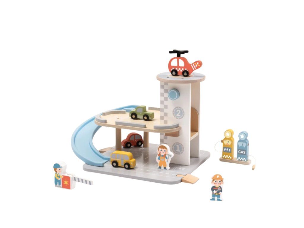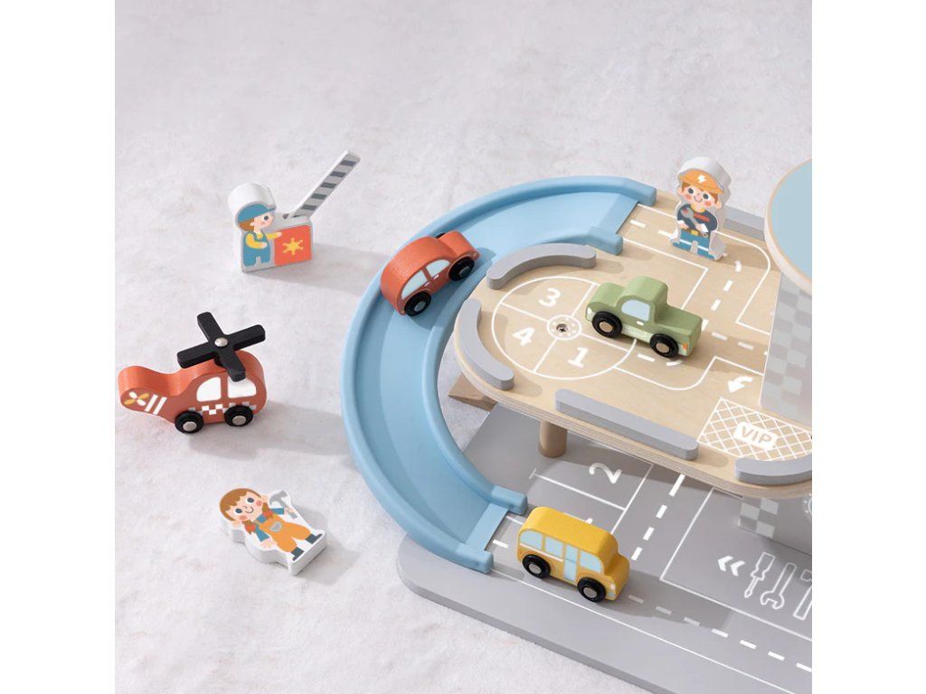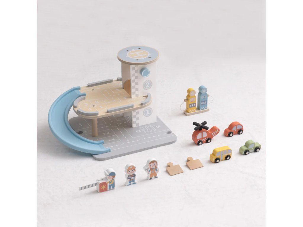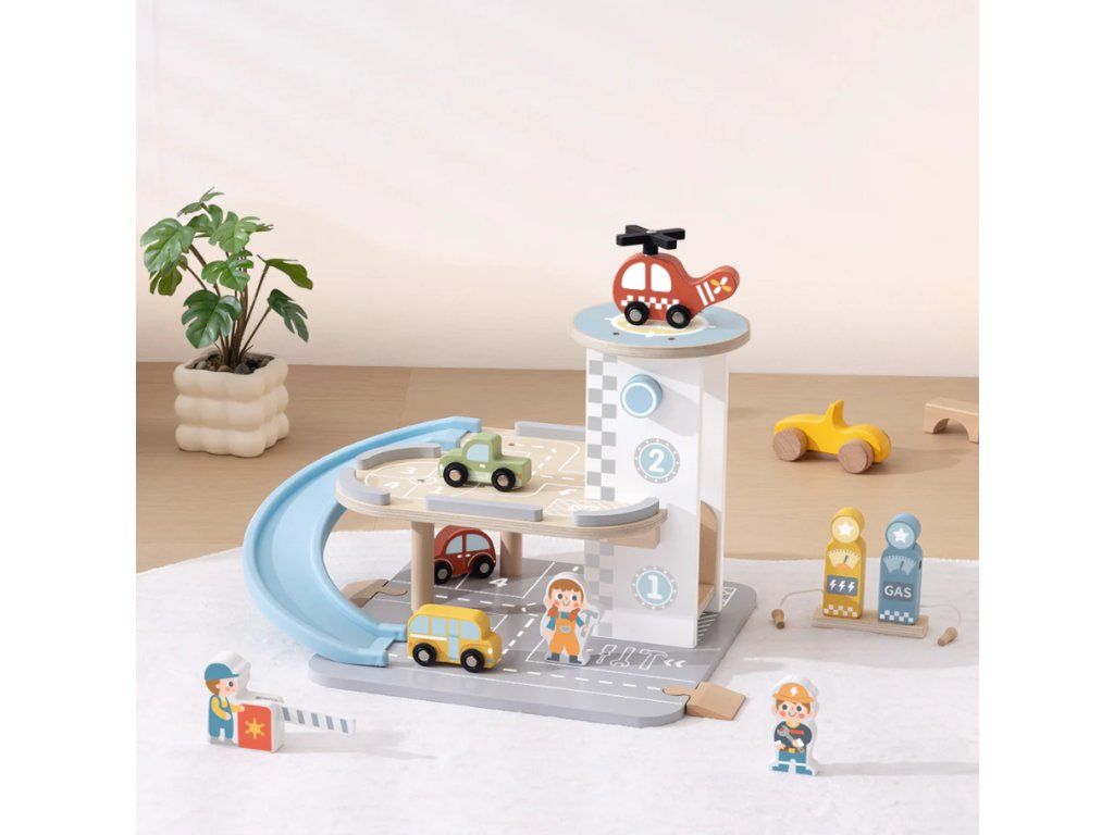 Garáž s autíčkyVíceúrovňová dřevěná parkovací garáž pro děti Otevřete s dětmi dveře do světa aut, vrtulníků a ramp – s touto dřevěnou garáží s autíčky od Tooky Toy se hra stává realistickým městem plným akce. Garáž má tři podlaží pro parkování, rampu se spirálou pro sjezd aut, mini vrtulník s parkovací plochou a čerpací stanici – to vše v jedné sadě. Děti milují učení hrou rozvíjejí jemnou motoriku a koordinaci ruka–oko, když přesouvají autíčka po rampách a spouštějí je po spirále rozlišují barvy, tvary a postupy, například čerpání a parkování tvoří příběhy a rolové situace – malý řidič, mechanik či dispečer chápou příčinu a následek, když autíčko „sjede“ rampou nebo vrtulník vystoupí na heliport Proč je tato garáž skvělá volba? tři podlaží parkování s rampou a spirálou – maximální interaktivita včetně dřevěného vrtulníku, doplňkových aut, značek a pumpy vyráběné z kvalitního dřeva s plastovými detaily, natřené netoxickými barvami – bezpečné a trvanlivé ideální jako dárek pro děti, které milují autíčka, dopravní hry a tvořivé hraní