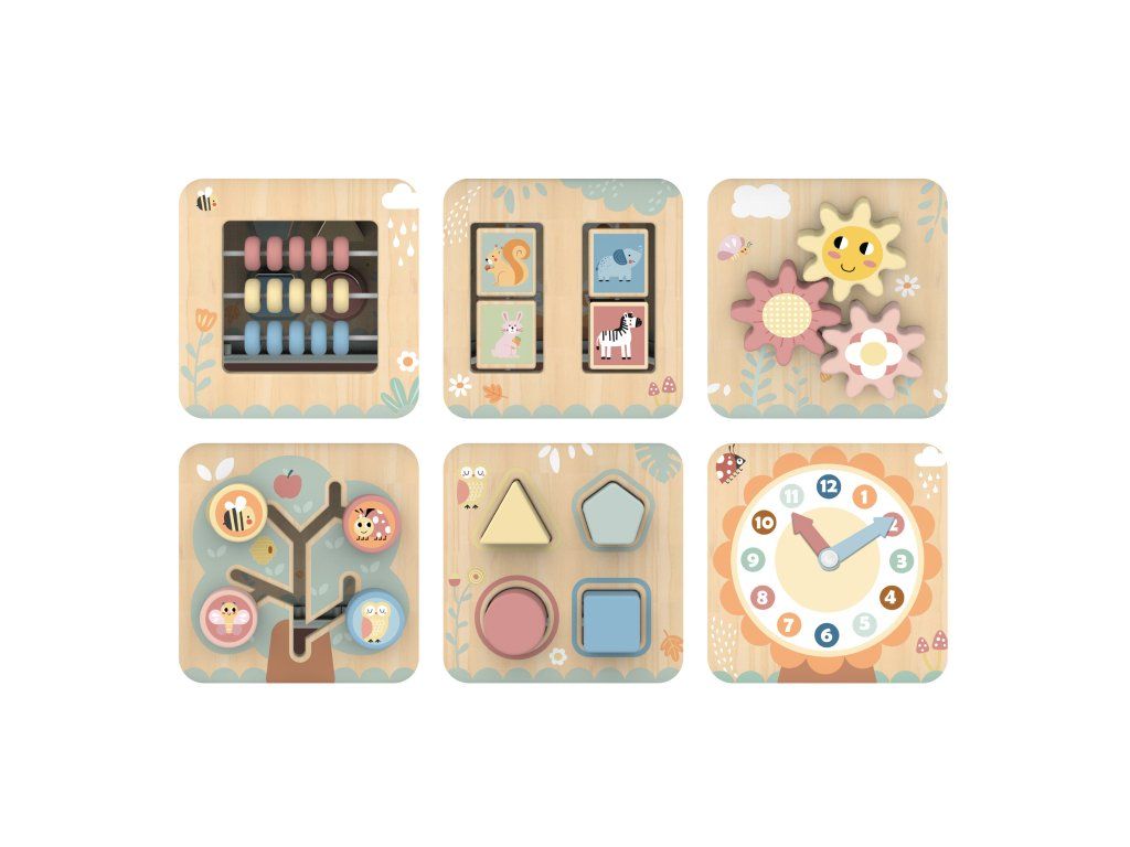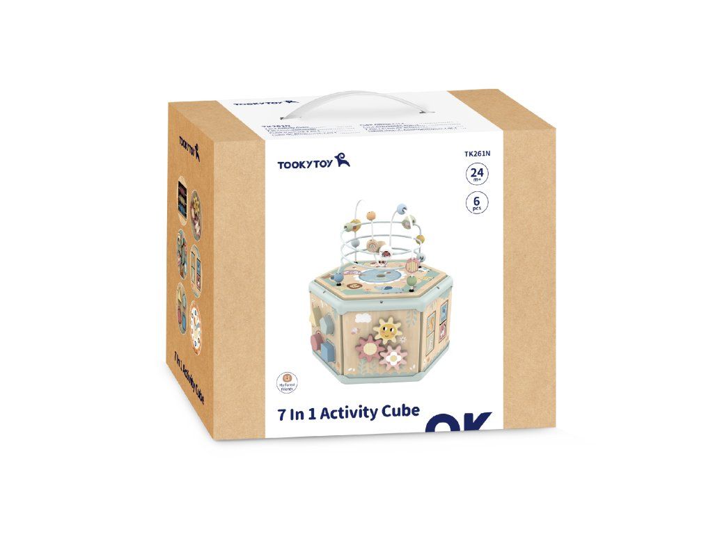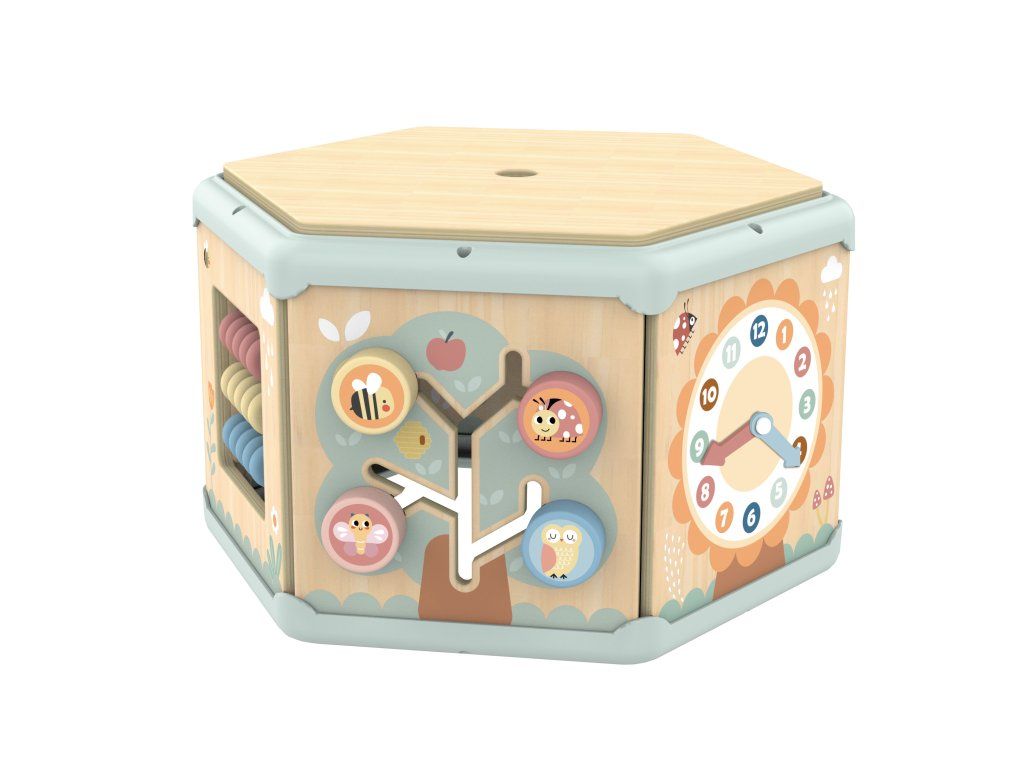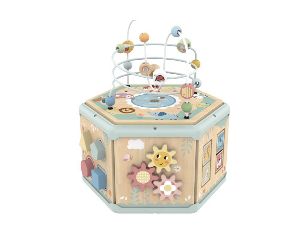 Kostka s aktivitami 7v1 Pastel Dřevěný multifunkční šestiúhelník se 7 aktivitami Interaktivní vzdělávací hračka od Tooky Toy v nadčasových pastelových barvách nabízí jiný typ aktivity na každé straně a jedna je i na víku. Děti mohou posouvat korálky či zvířátka motorickým bludištěm, otáčet ozubenými kolečky, vkládat tvary nebo se učit hodiny. Nechybí ani počítadlo či pexeso. Nápadité provedení této dřevěné motorické desky motivuje děti k samostatné hře.Děti se učí hrou a trénují jemnou motoriku Hraní s aktivní kostkou u dětí rozvíjí schopnost logického myšlení, koordinaci oko-ruka a cvičí si různé praktické dovednosti. Vrchní část kostky s motorickým korálkovým bludištěm je možné otevřít. Kromě vkládacích tvarů si do ní mohou dávat různé drobnosti. Aktivitní kostka je vyrobena z pevného dřeva z udržitelného lesnictví, natřená je netoxickými barvami a pro děti je bezpečná.