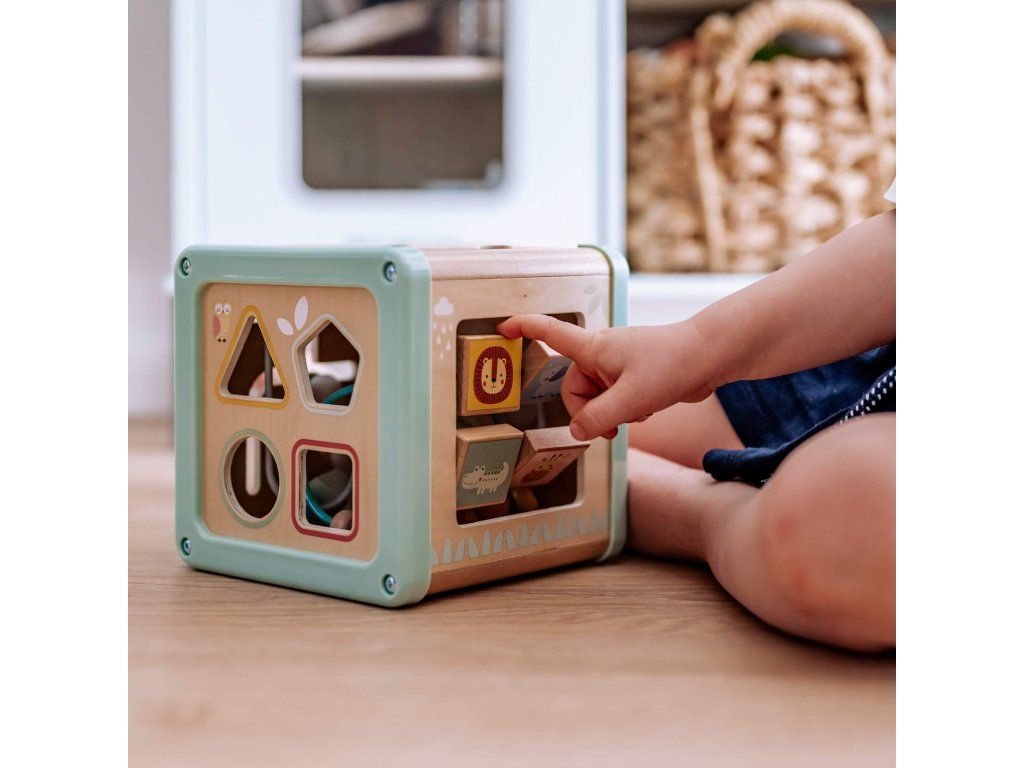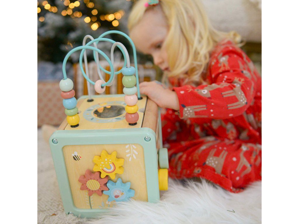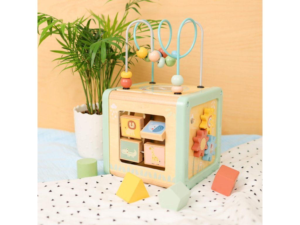 Kostka s aktivitami Louka Pastel 5 motorických aktivit v jednom! Krásná dřevěná kostka s aktivitami s lučními motivy v něžných pastelových barvách od Tooky Toy se stane zdrojem smysluplné zábavy pro vaše batolata. Obsahuje 5 různých motorických aktivit: bludiště se zvířátky, vkládačku se 4 tvary, ozubená kolečka, otáčecí obrázky se zvířátky a motorický labyrint se zrcátkem. Víko, na kterém je upevněn labyrint i zrcadlo, se dá jednoduše složit a zase nasadit, aby si děti mohly z kostky jednoduše vybírat geometrické tvary.Motorická kostka podporuje rozvoj dětí Díky této motorické hračce si děti rozvíjejí kognitivní i motorické dovednosti. Dřevěná kostka s aktivitami je proto skvělá jako smysluplný dárek pro děti. Hračky pro rozvoj motoriky Tooky Toy jsou nápadité, vyrobené z prvotřídního dřeva z udržitelných zdrojů a mají netoxické barvy a lak. Hračka je vhodná od 18 měsíců.