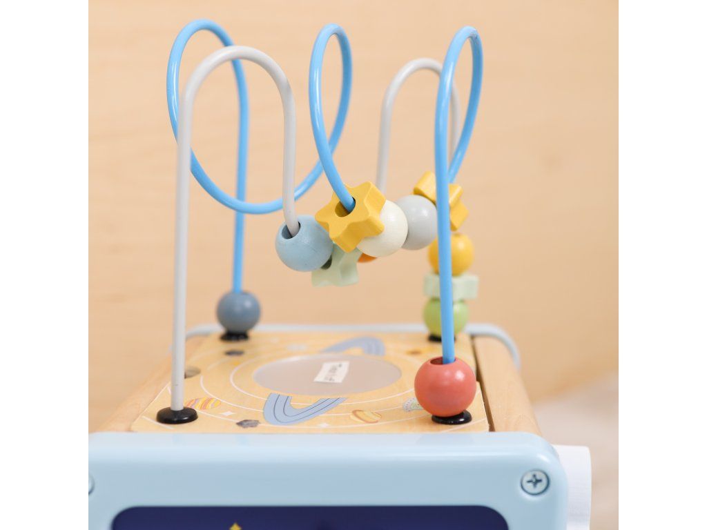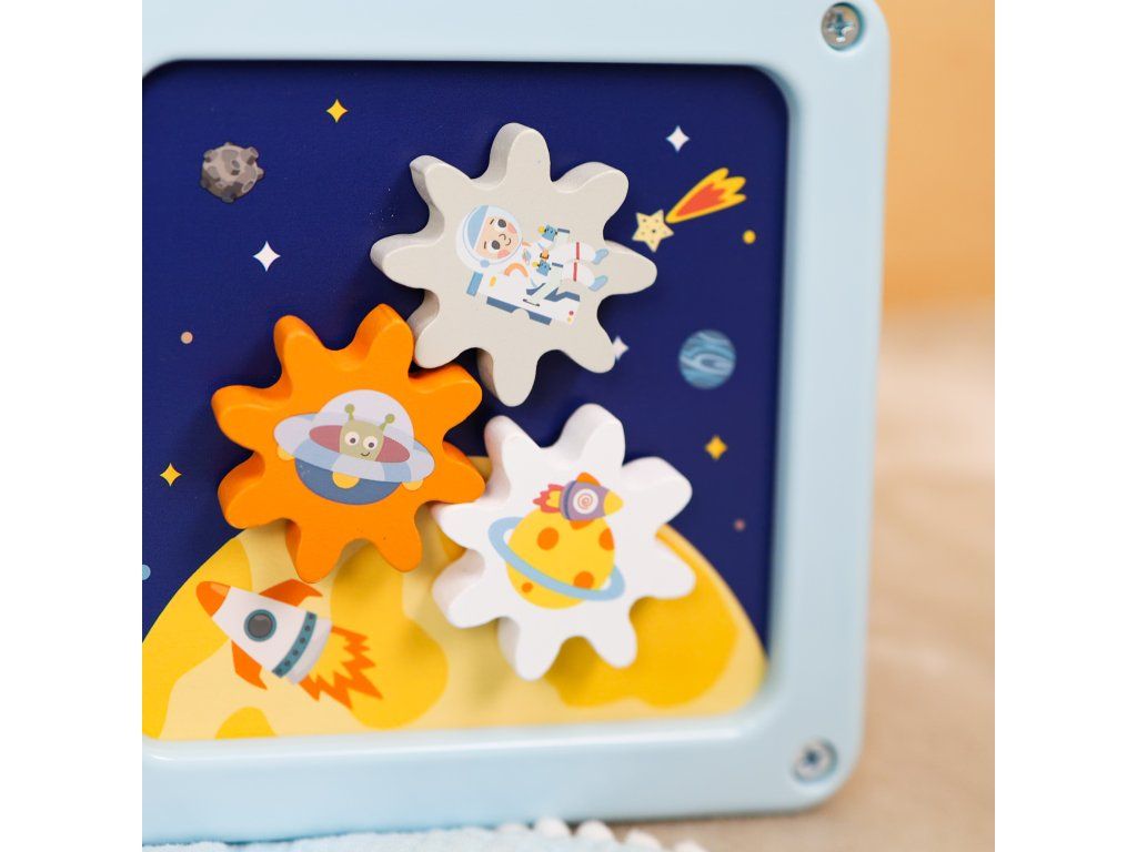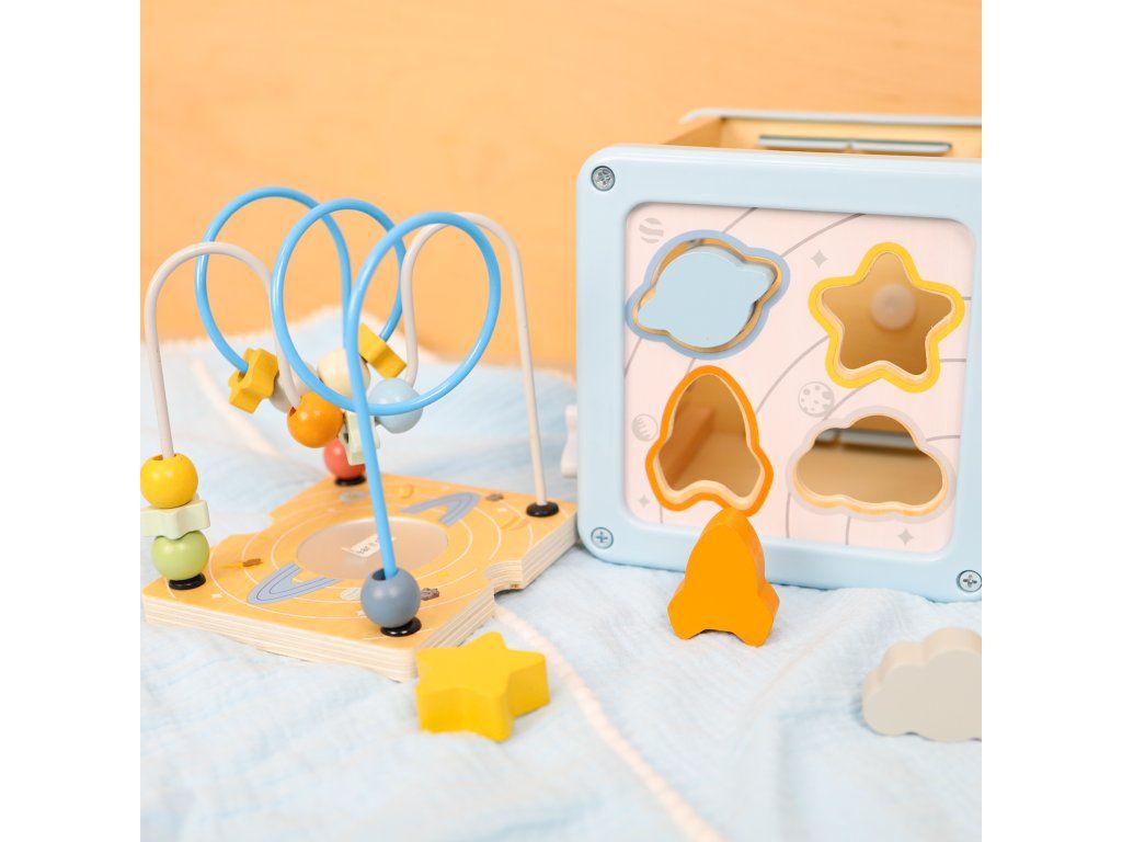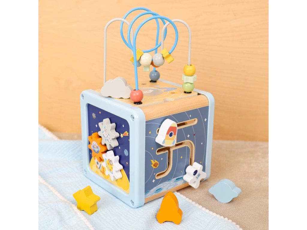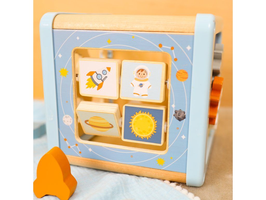 Krychle s aktivitami Vesmír 5 motorických aktivit v jednom Krásná dřevěná aktivity kostka s motivy vesmíru v něžných pastelových barvách od Tooky Toy se stane zdrojem smysluplné zábavy pro vaše batolata. Obsahuje 5 různých motorických aktivit: bludiště s astronautem a raketou, vkládačku se 4 tvary, ozubená kolečka, otáčecí obrázky s motivy vesmíru a motorický labyrint se zrcátkem. Víko, na kterém je upevněn labyrint i zrcadlo, se dá jednoduše složit a zase nasadit, aby si děti mohly z kostky jednoduše vybírat geometrické tvary.Motorická kostka podporuje rozvoj dětí Díky této motorické hračce si děti rozvíjejí kognitivní i motorické dovednosti. Dřevěná kostka s aktivitami je proto skvělá jako smysluplný dárek pro děti. Hračky pro rozvoj motoriky Tooky Toy jsou nápadité, vyrobené z prvotřídního dřeva z udržitelných zdrojů a mají netoxické barvy a lak. Hračka je vhodná od 18 měsíců.