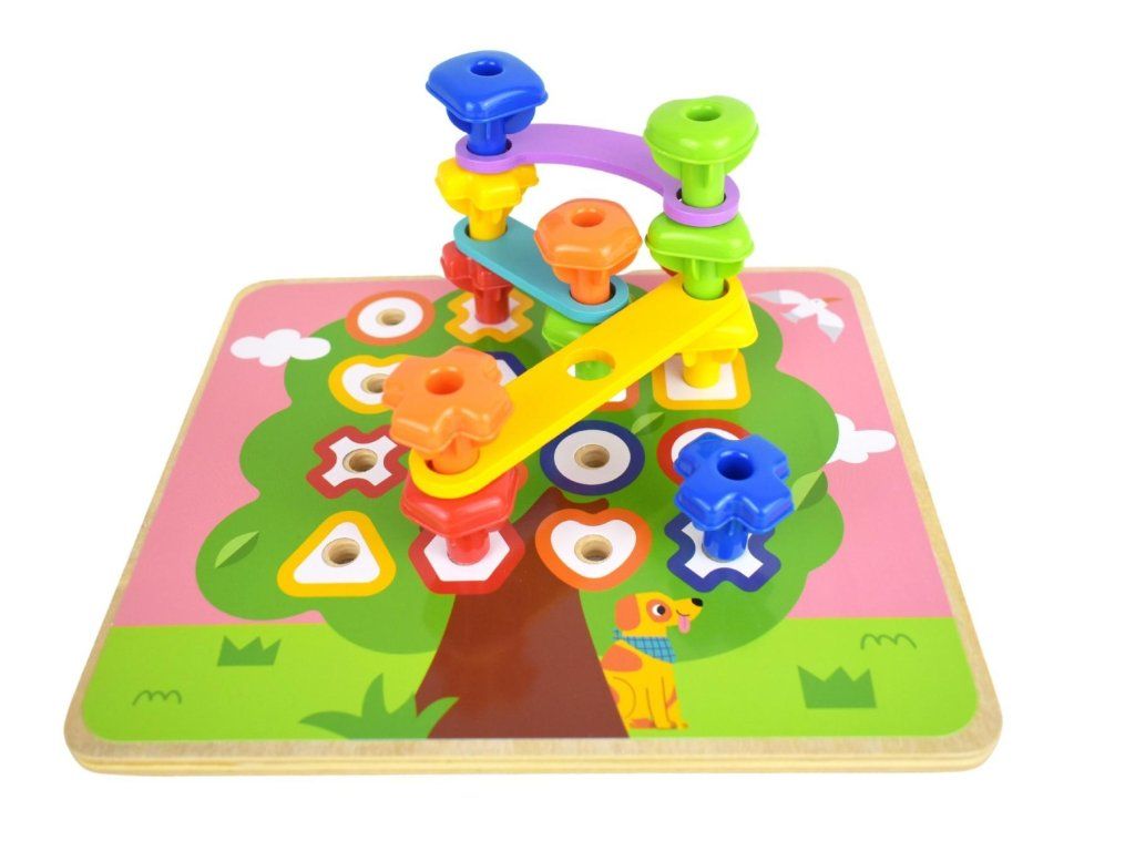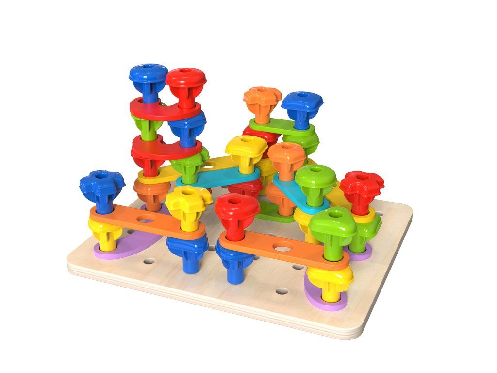 Logická stavebnice Duhová Stav, tříď, spojuj a navlékej! Jedinečná logická stavebnice obsahuje množství zábavných prvků, díky kterým si děti dokonale procvičí jemnou motoriku, logiku i kreativitu. Nejprve položí jednu z 8 předloh na dřevěnou desku s dírkami a poté do dírek nastrkají kolíčky odpovídajících barev a tvarů. Až na ně mohou skládat další součástky stavebnice. Dřevěnou desku ale mohou využít i samostatně a stavět si podle sebe. Díky plochým součástkám totiž mohou stavět do výšky.Děti si cvičí jemnou motoriku. Součástí sady je i provázek s jehlou pro nácvik navlékání kolíčků. Tato sada obsahuje vše, co potřebujete pro zábavné vzdělávání založené na hře. Díky své variabilitě si s ní děti budou rády hrát velmi často. Souprava je vyrobena ze dřeva s povrchovou úpravou nejvyšší kvality.