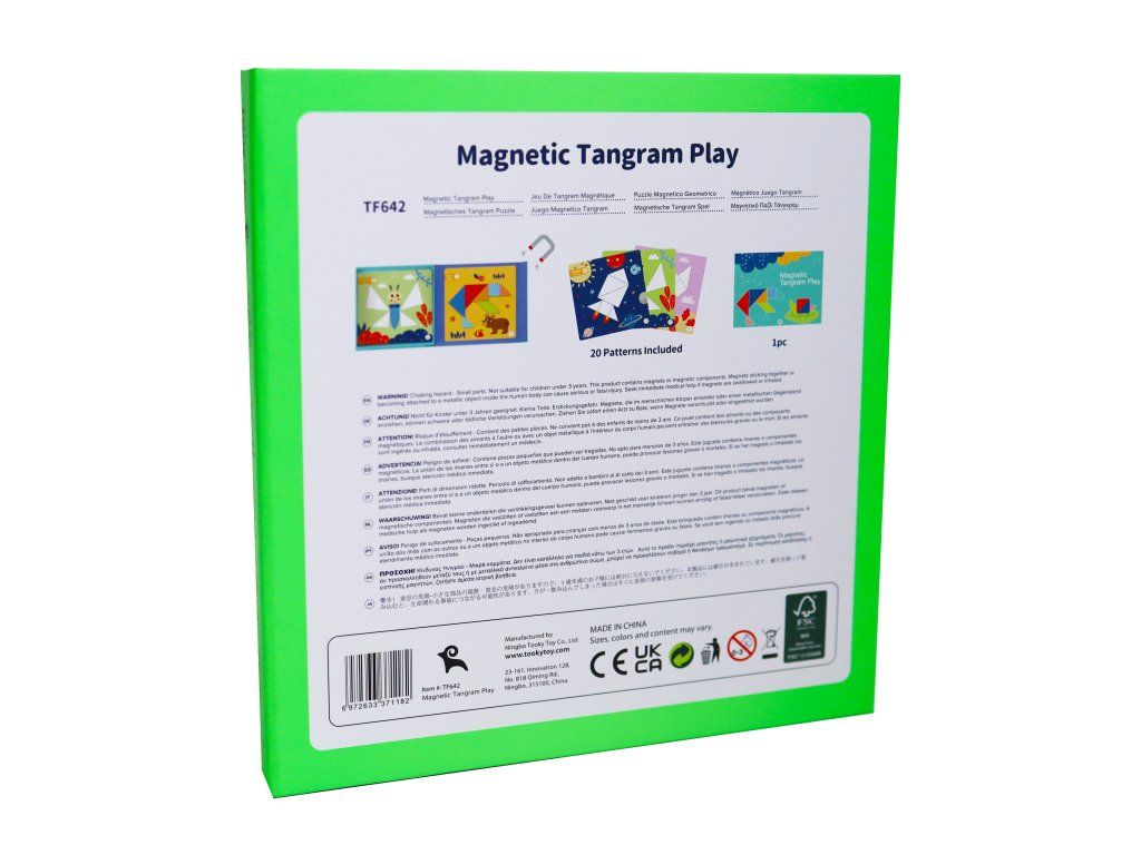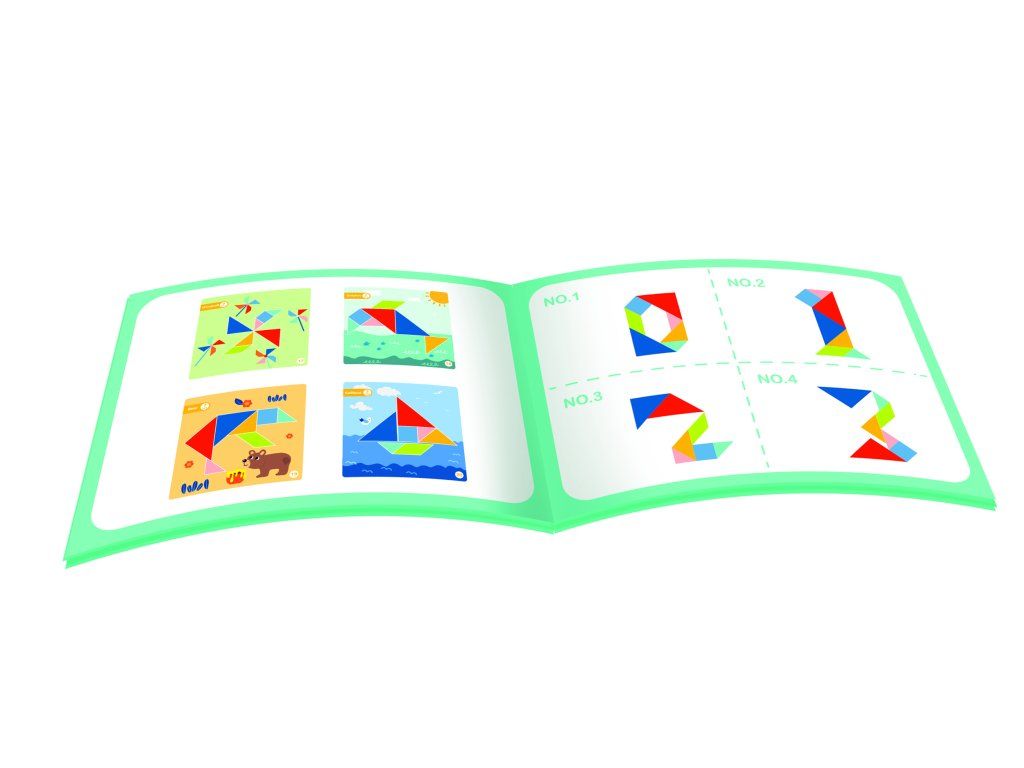 Magnetický tangram Sestav si zvířátko z geometrických tvarů! Magnetický box obsahuje 20 předloh s obrázky, které děti tvoří pomocí magnetek geometrických tvarů. Postaví si motýlka, medvídka nebo raketu a další. Knížka s úkoly je rozdělena do 3 úrovní obtížnosti. Děti trénují logické myšlení Cvičí koordinaci oko-ruka, jemnou motoriku, učí se barvy a tvary. Po hře zase všechno uklidí do magnetického boxu. Vše je vyrobeno z kvalitních materiálů s ohledem na životní prostředí a bezpečnost dítěte.
