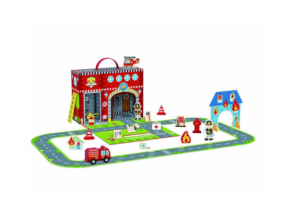 Hasičská stanice s dráhou v kufříku 18 ks Pro milovníky hasičů Hasičská stanice s dráhou v kufříku nadchne každého malého hasiče. Kufřík je praktický, snadno se skládá a otevírá a nabízí spoustu zábavy. Dítě se s ním zabaví na dlouho díky hasičskému autu a dráze, po které jezdí, hasicímu přístroji, hasiči a mnoha dalším dřevěným kouskům, které patří na hasičskou stanici Hasičská stanice v kufříku je ideální na cesty Když se děti unaví hraním, jednoduše vše vrátí do kufříku a díky madlu ho kamkoli snadno přenesou. Kufřík Hasičská stanice je vyroben z kvalitního kartonu, hračky zase z pevného, dobře opracovaného dřeva natřeného netoxickými barvami. Sada obsahuje 18 kusů hraček.