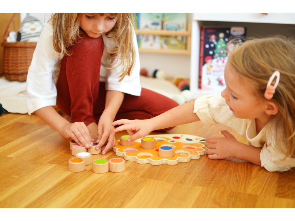 Senzorický Ježek Hmatej a přiřaď! Na deseti válečcích se nachází deset různých druhů materiálů a povrchů, stejně jako na dřevěné podložce ve tvaru ježka. Úkolem dítěte je rozpoznat hmatem jednotlivé materiály a přiřadit dřevěné válečky do příslušných otvorů na ježkovi. Děti si rozvíjejí jemnou motoriku Tato aktivita rozvíjí hmatové smysly dítěte, koordinaci oko-ruka a rozpoznávání základních barev.