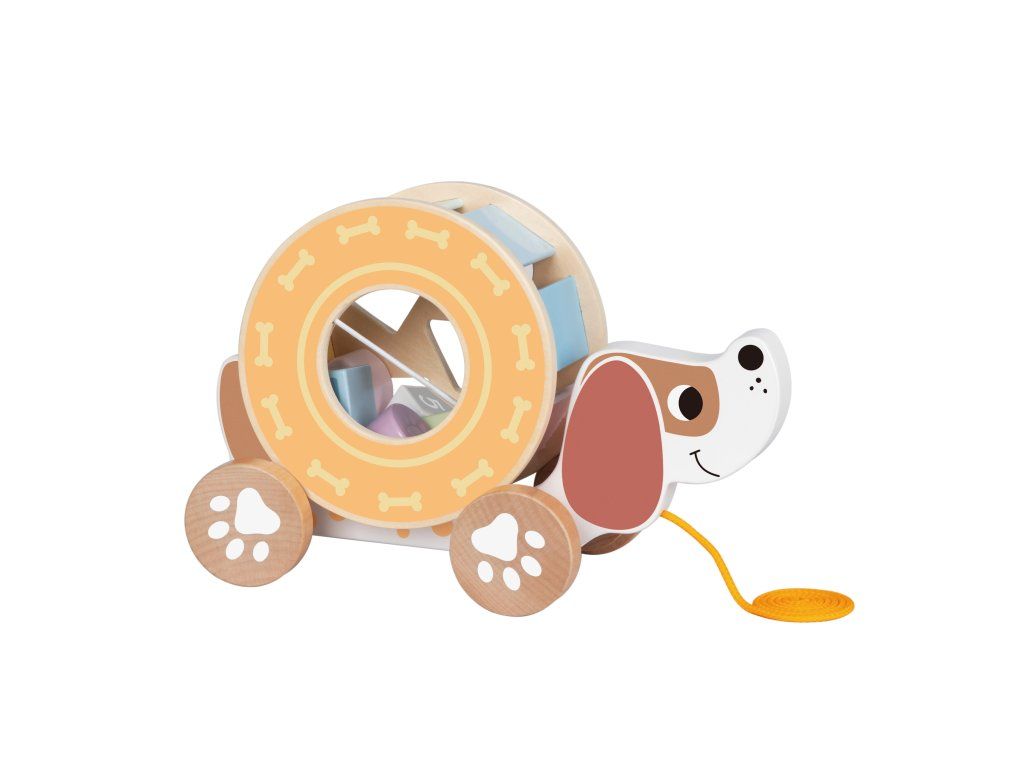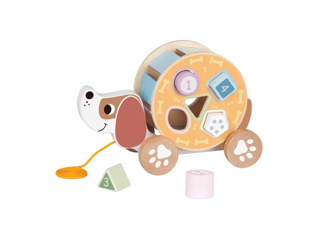 Velký tahací pes Tvůj nový kamarád, pejsek Nádherný dřevěný pejsek v pastelových barvách na šňůrce bude děti motivovat k pohybu a učení. Lze ho tahat po zemi díky kolečkům, ale zároveň do něj mohou vkládat veselé barevné geometrické tvary.Děti si zlepšují pohybové schopnosti Tahací hračky motivují batolata k chůzi a běhu. Zlepšují si tak hrubou motoriku. Pejsek je z pevného a odolného dřeva, což zaručuje jeho dlouhou životnost.