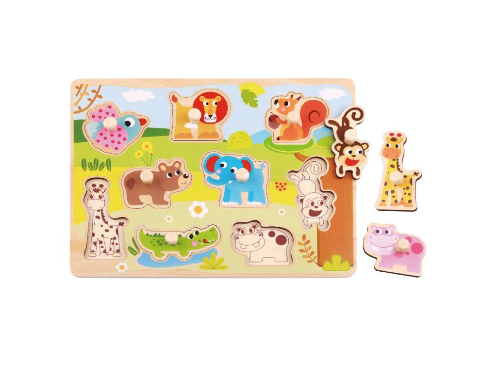 Vkládací puzzle Zvířata Děti se naučí pojmenovat různá zvířátka. Tematické puzzle obsahuje podkladovou desku a 9 dřevěných zvířátek. Je odolná, vyrobená z udržitelného dřeva, ručně natřená barvami na vodní bázi a fixovaná lepidlem bez formaldehydu.Vkládací puzzle rozvíjí jemnou motoriku. Zlepšuje také koordinaci oko-ruka, trpělivost a schopnost samostatně se hrát. Díky velkým dílkům s úchytkami je vhodná již pro děti od 18 měsíců.