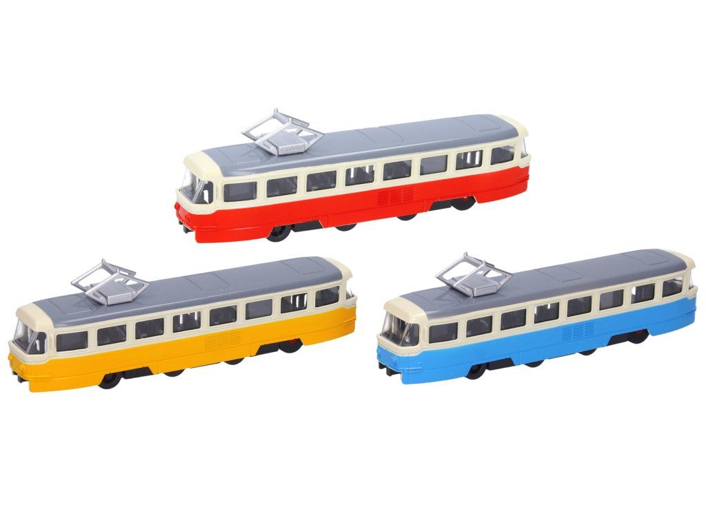 Tramvaj kovová. Velikost 16 cm. Na zpětné natažení. Světelné a zvukové efekty. 3xAG13 baterie součástí. 3 varianty - modrá, žlutá, červená. Věk: 3+