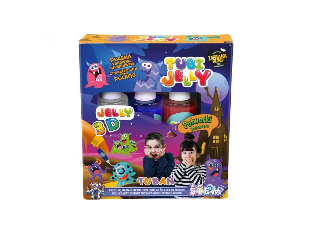 Tubi Jelly Kreativní set Příšerky Vytvořte si 3D gelové figurky Tubi Jelly set je jedinečná tvořivá sada na tvorbu trojrozměrných figurek. Sada obsahuje 3 barevné gely a šablony na kreslení s motivy příšerek. Po vyplnění šablony gely ji ponoříte do rozpuštěného aktivátoru a vaše postavička se promění na svou trojrozměrnou verzi. Díky přiložené prázdné fólii si děti mohou nakreslit a vytvořit cokoliv je napadne.Sada obsahuje: tekutý gel 150 ml ve 3 barvách (bílá, modrá, červená), tematické šablony, 3 x 5 g aktivátoru, nádobu na přípravu figurek.Oceněná hračka roku 2021 V roce 2021 byl produkt Tubi Jelly oceněn titulem Hračka roku v kategorii kreativní hračky. Vyzkoušejte ho i vy.Všechny produkty značky Tuban jsou vyrobeny z kvalitních materiálů, jsou bezpečné a netoxické, což znamená, že se nemusíte obávat o zdraví svých dětí a můžete mít jistotu, že je čekají jen ty nejlepší zážitky.