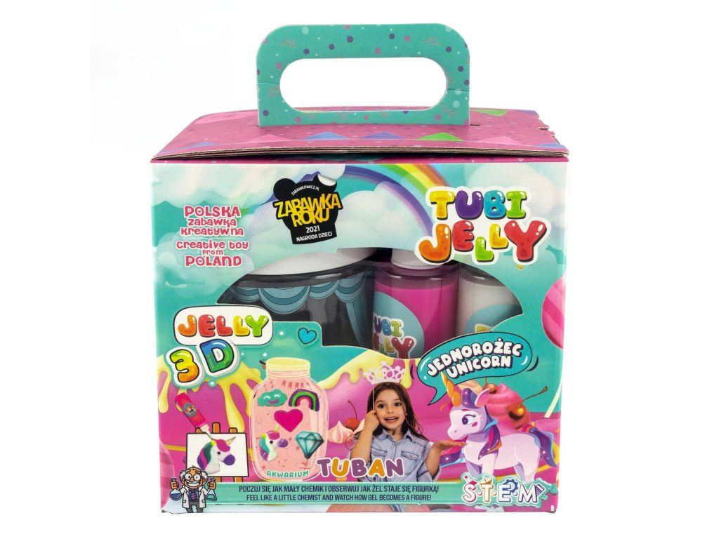 Tubi Jelly Kreativní set s akváriem XL Jednorožec Vytvořte si 3D gelové figurky Tubi Jelly set je jedinečná tvůrčí sada pro tvorbu trojrozměrných figurek. Sada XL obsahuje až 6 barevných gelů. Součástí jsou také šablony na kreslení s motivy jednorožců. Po vyplnění šablony gely ji ponoříte do rozpuštěného aktivátoru a vaše postavička se promění na svou trojrozměrnou verzi. Díky přiložené prázdné fólii si děti mohou nakreslit a vytvořit cokoliv je napadne. Vytvořené figurky a tvary můžete umístit do přiloženého akvária, které naplníte vodními krystaly a vytvoříte si tak svůj vlastní malý svět fantazie.Sada obsahuje: tekutý gel 150 ml v 6 barvách, tematické šablony, 6 x 5 g aktivátoru, vodní krystaly, nádobu na přípravu figurek, akvárium.Oceněná hračka roku 2021 V roce 2021 byl produkt Tubi Jelly oceněn titulem Hračka roku v kategorii kreativní hračky. Vyzkoušejte ho i vy.Všechny produkty značky Tuban jsou vyrobeny z kvalitních materiálů, jsou bezpečné a netoxické, což znamená, že se nemusíte obávat o zdraví svých dětí a můžete mít jistotu, že je čekají jen ty nejlepší zážitky.