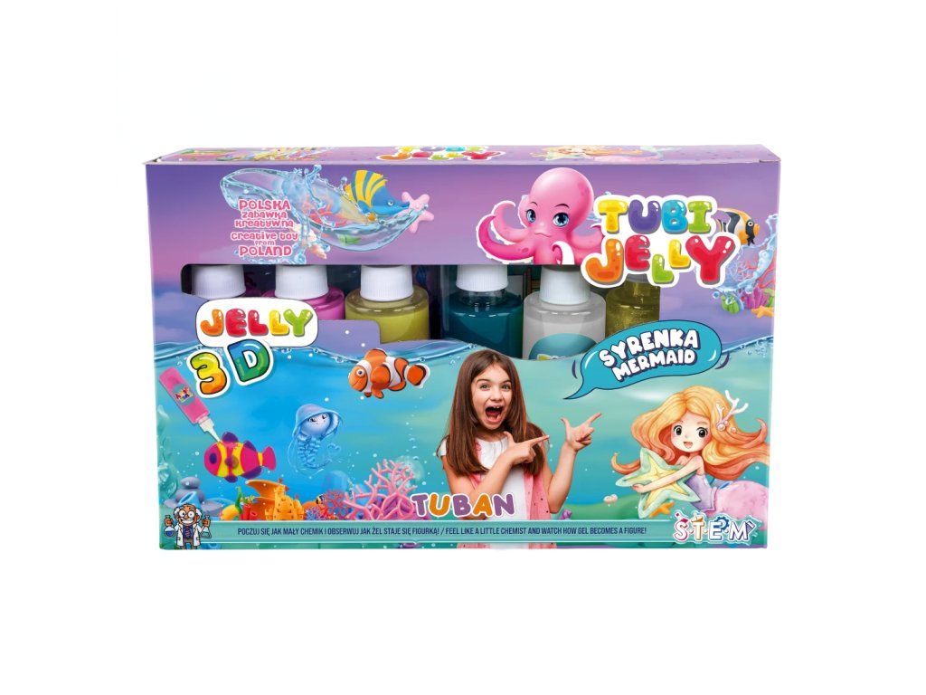 Tubi Jelly Kreativní sada XL Mořská panna Vytvořte si 3D gelové figurky Tubi Jelly sada je jedinečná tvořivá sada na tvorbu trojrozměrných figurek. Sada XL obsahuje až 6 barevných gelů. Součástí jsou také šablony na kreslení s motivy mořských panen. Po vyplnění šablony gely ji ponoříte do rozpuštěného aktivátoru a vaše postavička se promění na svou trojrozměrnou verzi. Díky přiložené prázdné fólii si děti mohou nakreslit a vytvořit cokoliv je napadne.Sada obsahuje: tekutý gel 150 ml v 6 barvách, tematické šablony, 3 x 5 g aktivátoru, nádobu na přípravu figurek.Oceněná hračka roku 2021 V roce 2021 byl produkt Tubi Jelly oceněn titulem Hračka roku v kategorii kreativní hračky. Vyzkoušejte ho i vy.Všechny produkty značky Tuban jsou vyrobeny z kvalitních materiálů, jsou bezpečné a netoxické, což znamená, že se nemusíte obávat o zdraví svých dětí a můžete mít jistotu, že je čekají jen ty nejlepší zážitky.