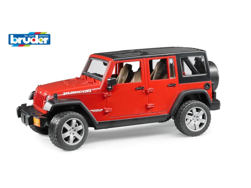 Jeep Wrangler Unlimited Rubicon, 1:16. Tento jeep nejen vypadá jako oslnivé terénní vozidlo, ale také nabízí nespočet funkcí pro téměř neomezenou zábavu a hraní. Střecha je dvoudílná, oddělitelná, lze také otevírat kapotu a zadní i boční dveře. Je samozřejmostí, že vozidlo poskytuje dostatek prostoru pro čtyři BRUDER figurky. Lze vyjmout zadní sedadla a vytvořit tak místo pro další vybavení. Pro usnadnění řízení slouží prodloužení volantu, které lze uložit, když se nepoužívá, na podvozek. Náprava a vzorek pneumatik je přizpůsoben pro těžký terén v kombinaci s atraktivním vzhledem SUV kol. Přední kapota je otevíratelná, s možností zajištění v otevřené poloze a dodatečným připevněním navíjecího lana a táhla, čímž vznikají nespočetné možnosti vylepšování vozidla BRUDER. Rozměr: 329 x 144 x 142 mm. Věk: 3+