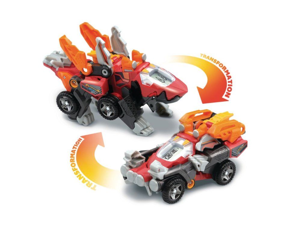 V okamžiku se tento stále hladový dinosaurus dokáže proměnit na „vytuněné“ závodní auto! Displej s animacemi se mění v závislosti na režimu hry: Dinosaurí oči nebo pilot v režimu závodního speciálu.
