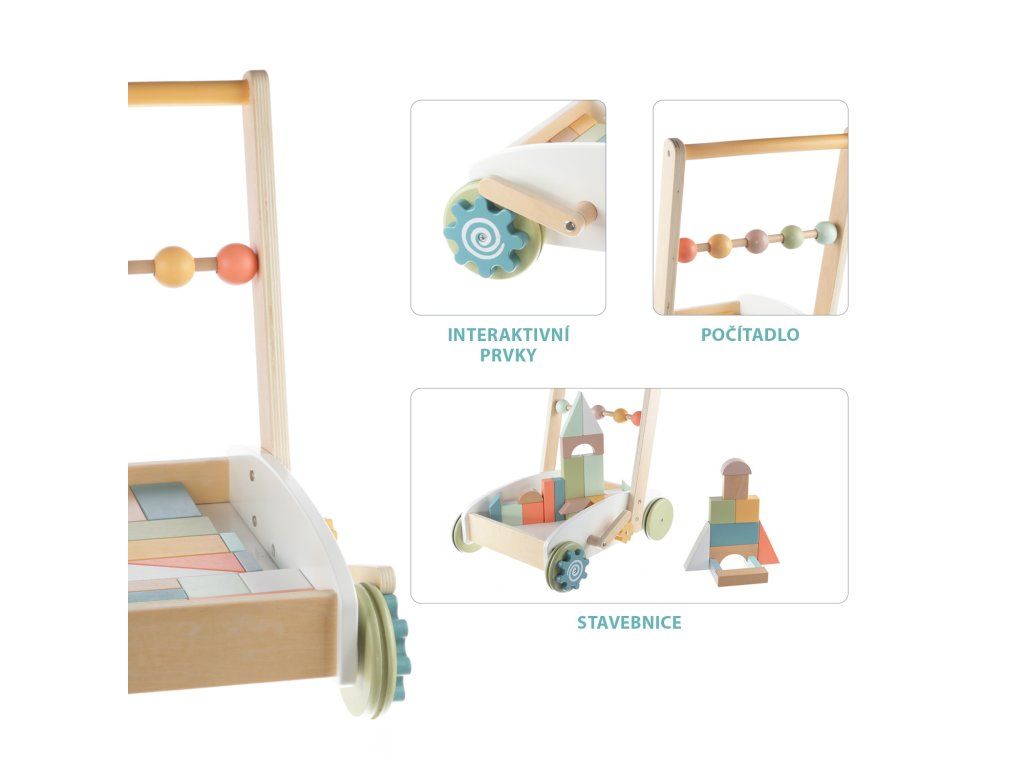Kompaktní vozík s dřevěnou rukojetí je plný různobarevných kostek, ze kterých si dítě může postavit cokoliv. Pokud se z vozíku odstraní kostky, může se použít na přepravu jiných hraček. Rukojeť má dřevěné kuličky, které se dají posouvat z jedné strany na druhou. Odolná kolečka zvládnou jakýkoliv typ podlahy. Hračka