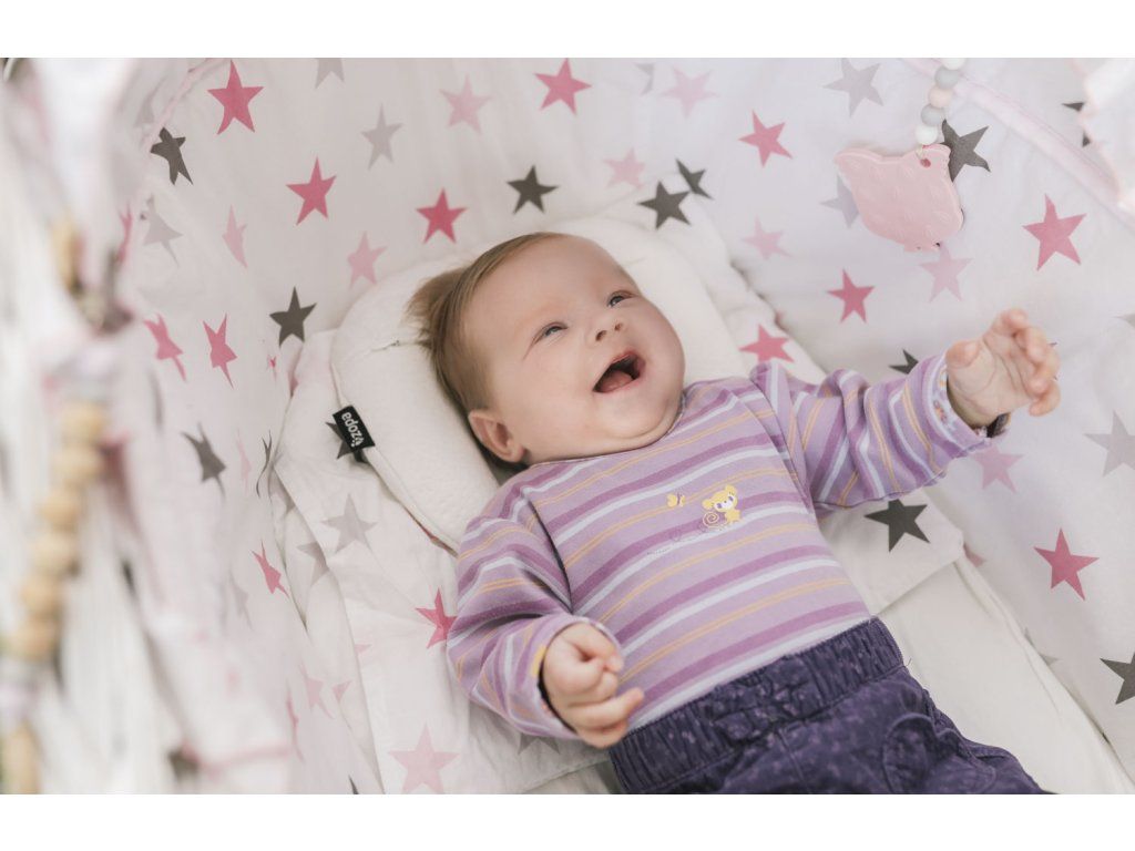Díky vysoké prodyšnosti zabraňuje nadměrnému pocení. Polštář lze použít v postýlce, kočárku i autosedačce.