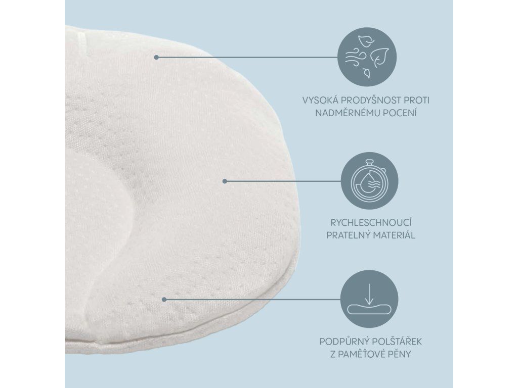 Měkký polštář z paměťové pěny vhodný pro děti od narození.
