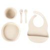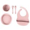 Sada nádobí z potravinářského silikonu obsahuje misku se zvýšenými okraji a přísavkou, dělený talířek s přísavkou, nastavitelný bryndák a lžičku.