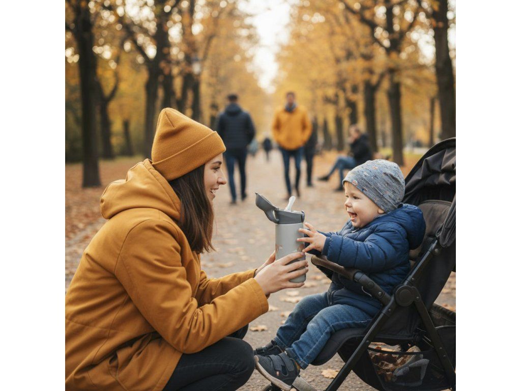 Ovládání jednou rukou: Víčko se otevírá pomocí tlačítka, ideální na cesty nebo do kočárku.